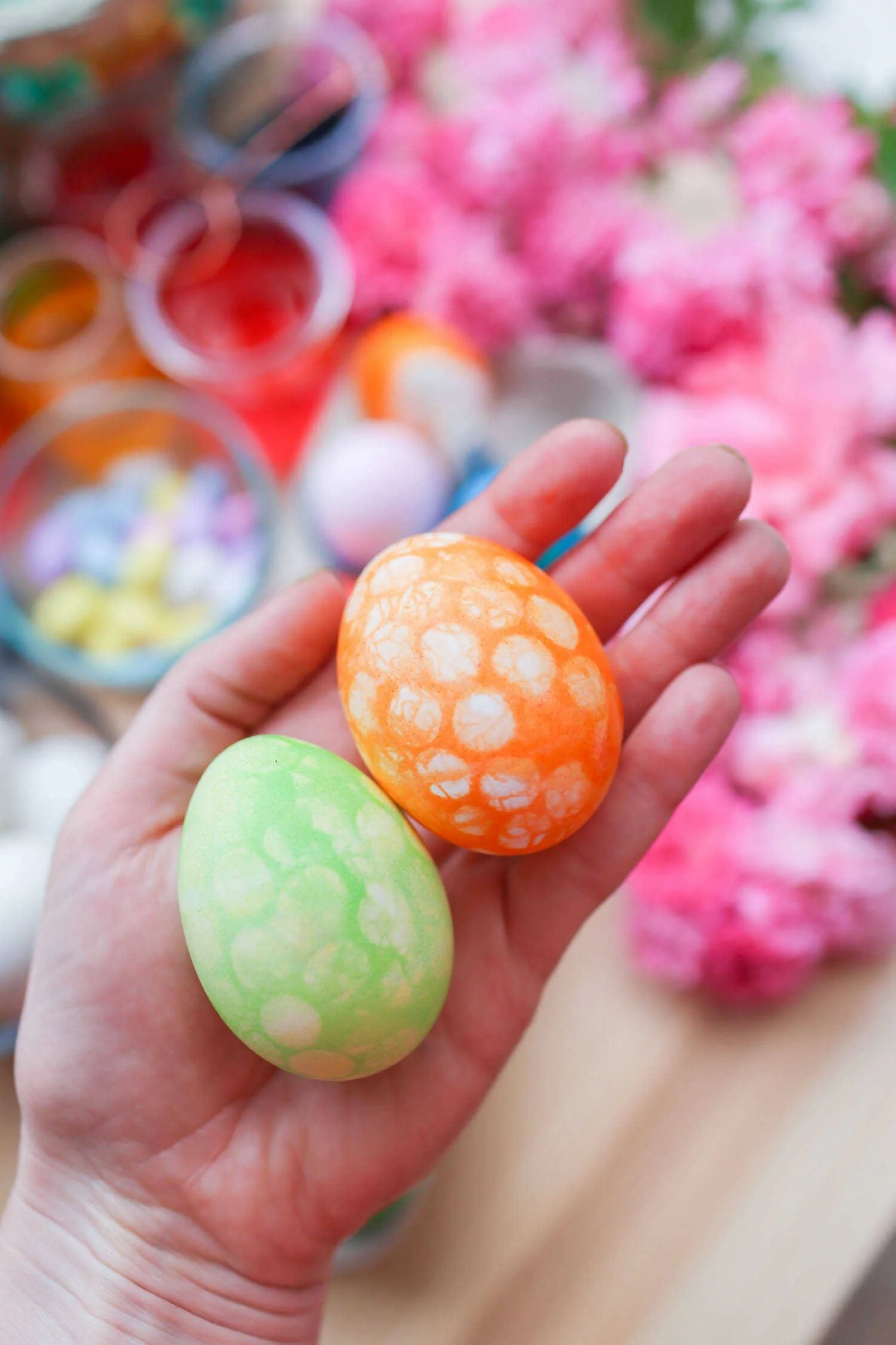One really fun and simple to add some pizzaz to your eggs is to first wrap them in scotch tape, leaving some areas of the eggshell exposed. When you put it into the dye, it will give you a tie-dye effect. You can also do the same thing with bubblewrap to make mosaic designed eggs (see the images of my orange and lime green mosaic eggs).
