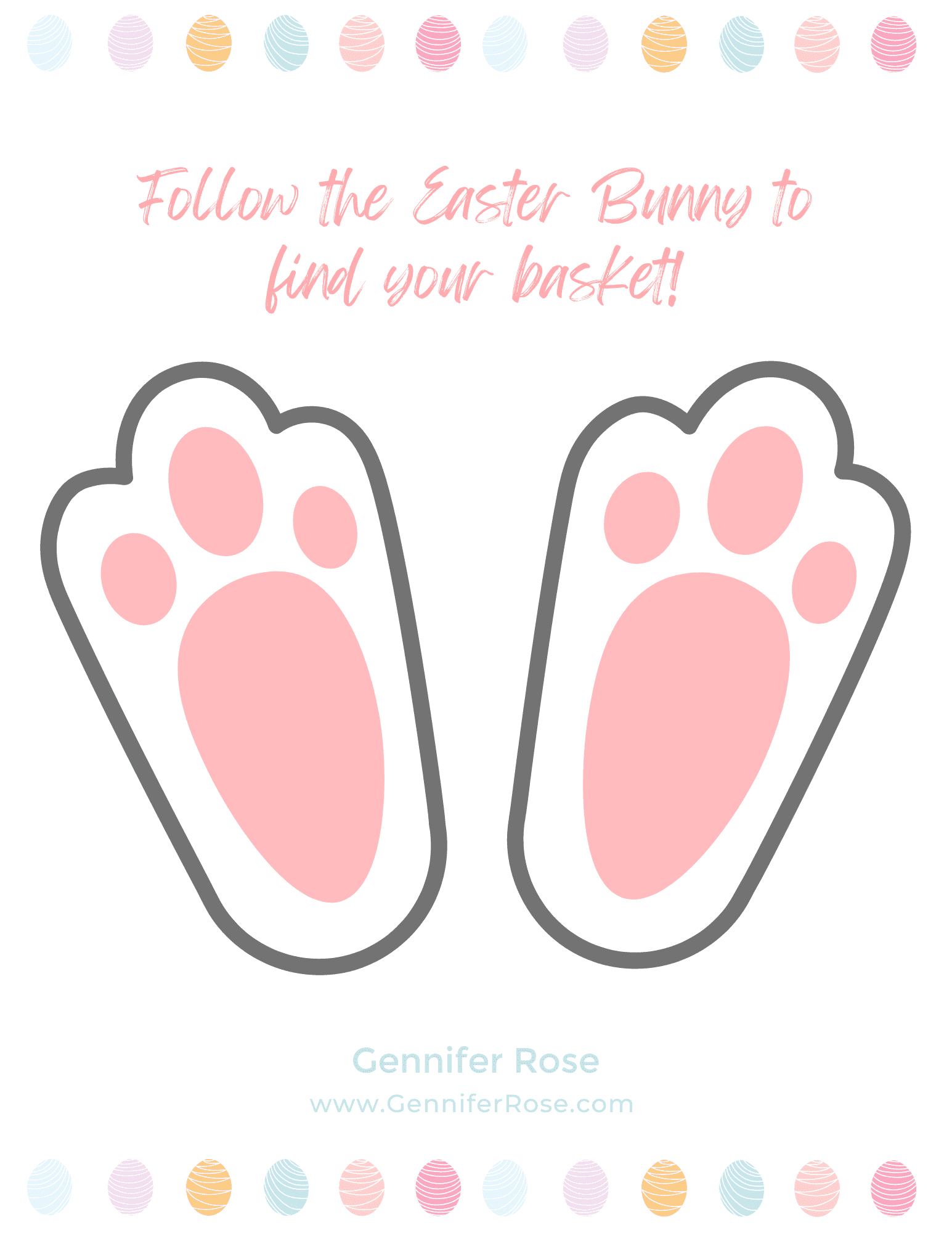 For small toddlers who aren’t able to decipher clues yet, you can use my printable “Easter Bunny Footprints” and make a trail for them to follow to find their Easter basket. Just print and cut out the rabbit footprints and tape them on the floor in a line leading up to the basket’s hiding spot.