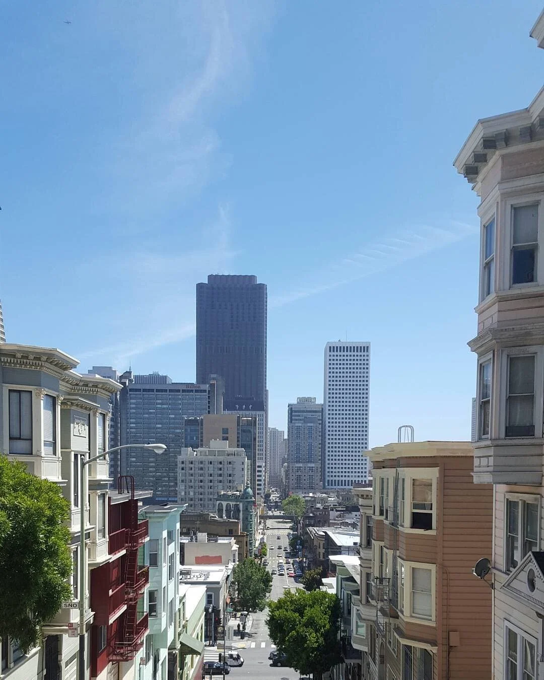 The Transamerica Building is visible from many viewpoints in the city and it takes a great picture. If you walk towards North Beach up a hill, you can snap a great photo like this one.