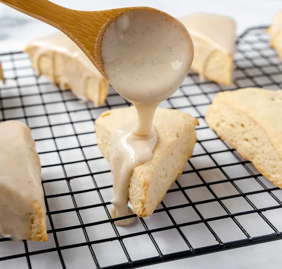 Tender and fluffy vanilla bean scones with vanilla glaze. The post contains instructions on how to make full sized scones and petite scones. Recipe by Barefoot in the Pines.