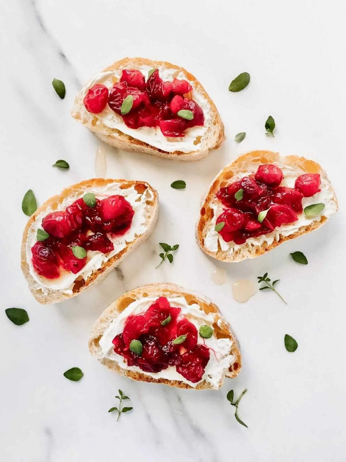 These cranberry cream cheese toasts combine fresh fruit, honey and herbs for a fun mini toast. Super easy to make, flavorful and perfect for a tea party! Recipe by Through the Fibro Fog.