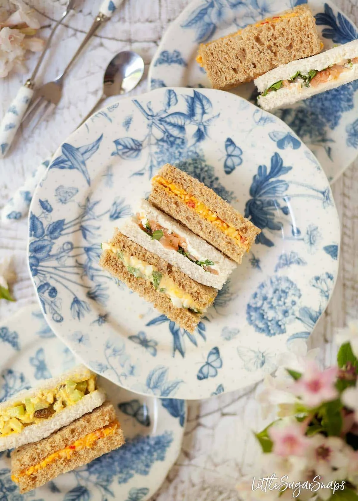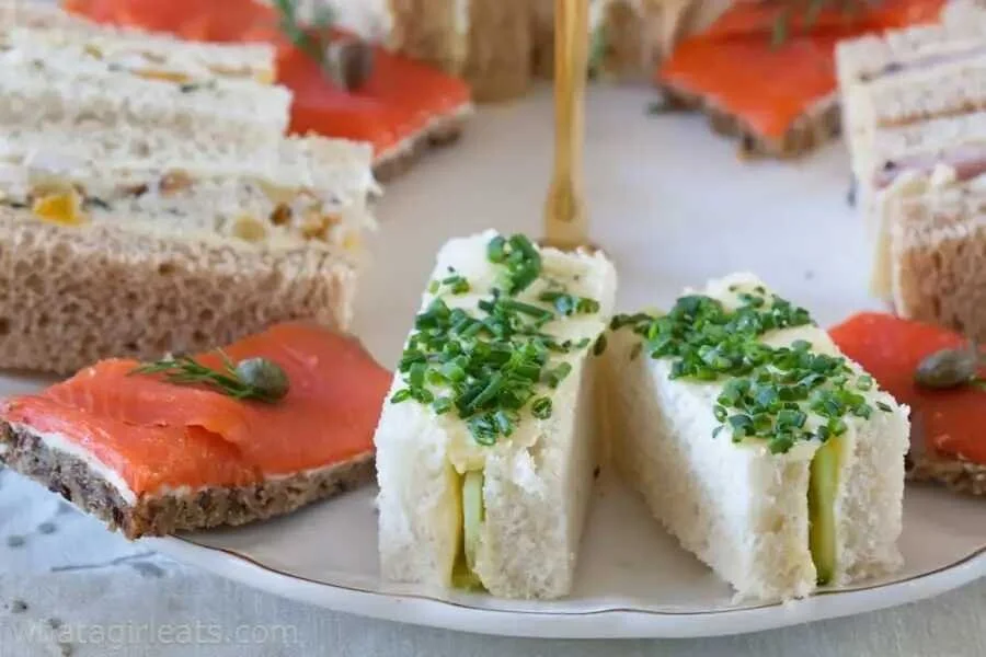 A mouthwatering selection of traditional English tea sandwiches that make your heart sing. In this blog post she has a variety of tea sandwich recipes including basic egg, smoked salmon, cucumber and chicken with cranberry sauce! Recipes by What a Girl Eats.