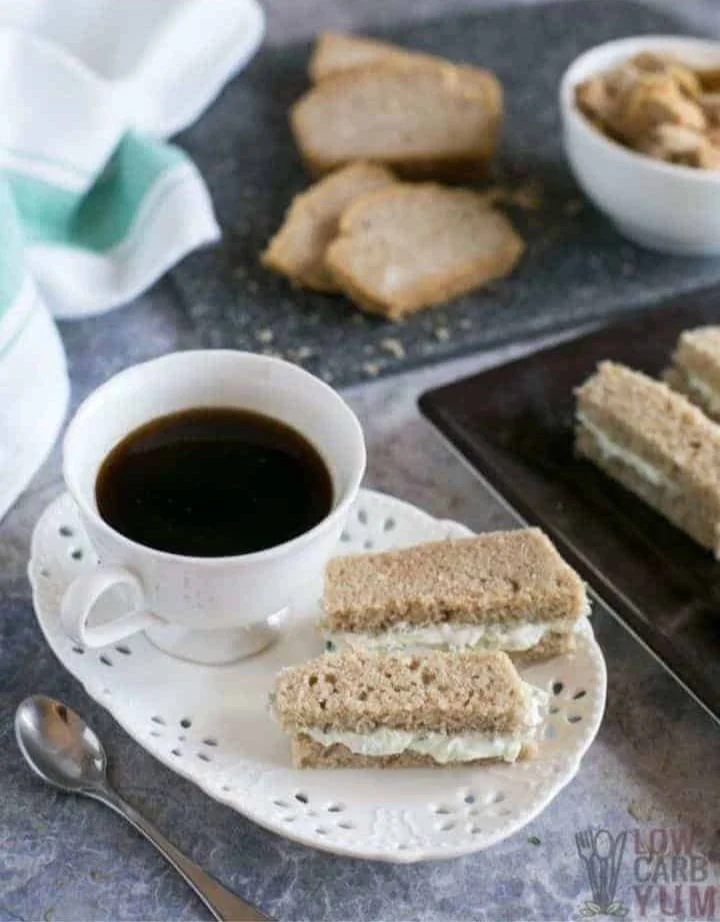 In addition to finger sandwiches, some tea party menus include savory scones, soups, quiches, or lighter savory appetizers such as roasted nuts or cheese and crackers.
