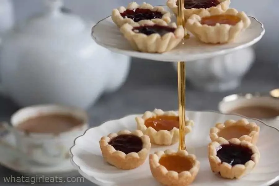Jam tarts taste great with a cup of tea or as part of an Afternoon Tea tray alongside a variety of sweets. A Jam Tart is made with a piece of dough and a dab of jam. You may make them large to share or tiny for each individual guest. They're great with a dollop of whipped cream or clotted cream and a dusting of finely diced nuts. Recipe by What a Girl Eats.