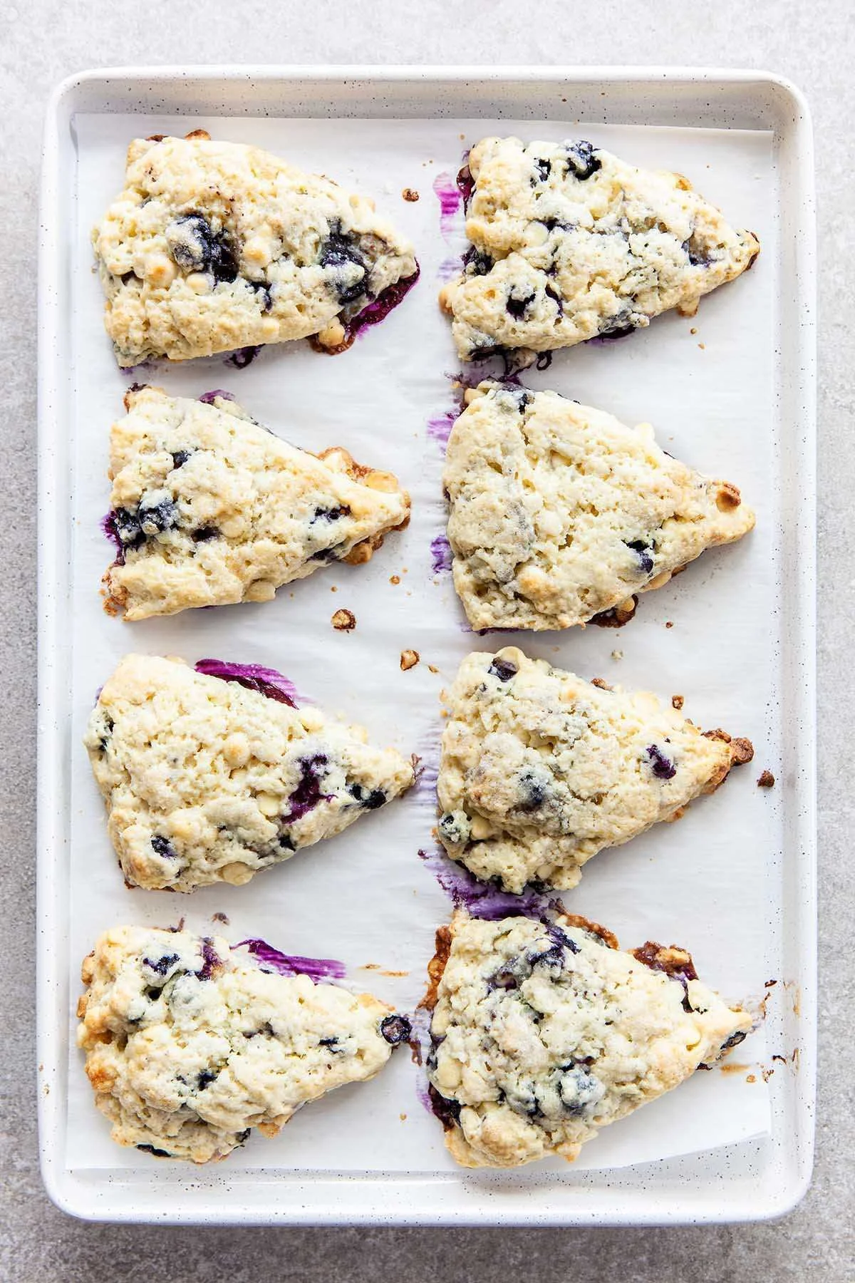 These delicious blueberry white chocolate scones are perfect for brunch or afternoon tea. Perfectly light and soft scones coated with a lemon glaze and stuffed with white chocolate chips and fresh blueberries. These cakey scones pair perfectly with a cup of hot tea with cream. Recipe by Kelly Neil.
