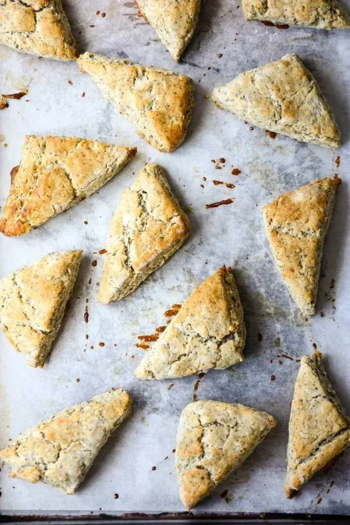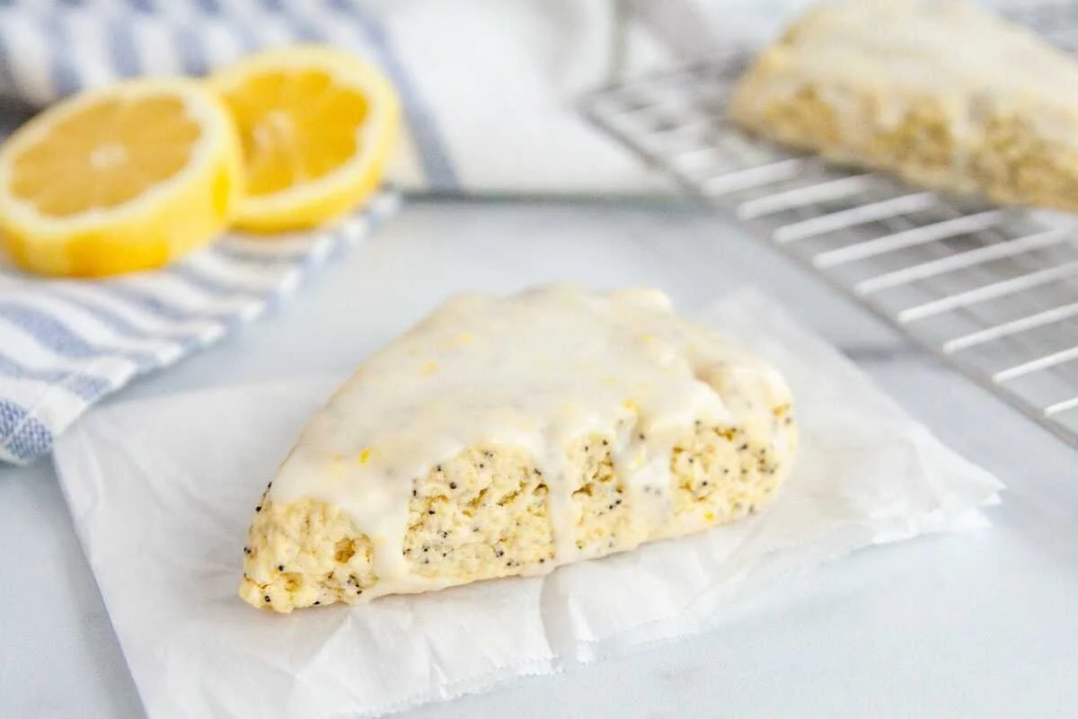 Zesty and fluffy scones that are both melt in your mouth and refreshing. These cream scones are peppered with poppy seeds and loaded with lemon. Recipe by Barefoot in the Pines.