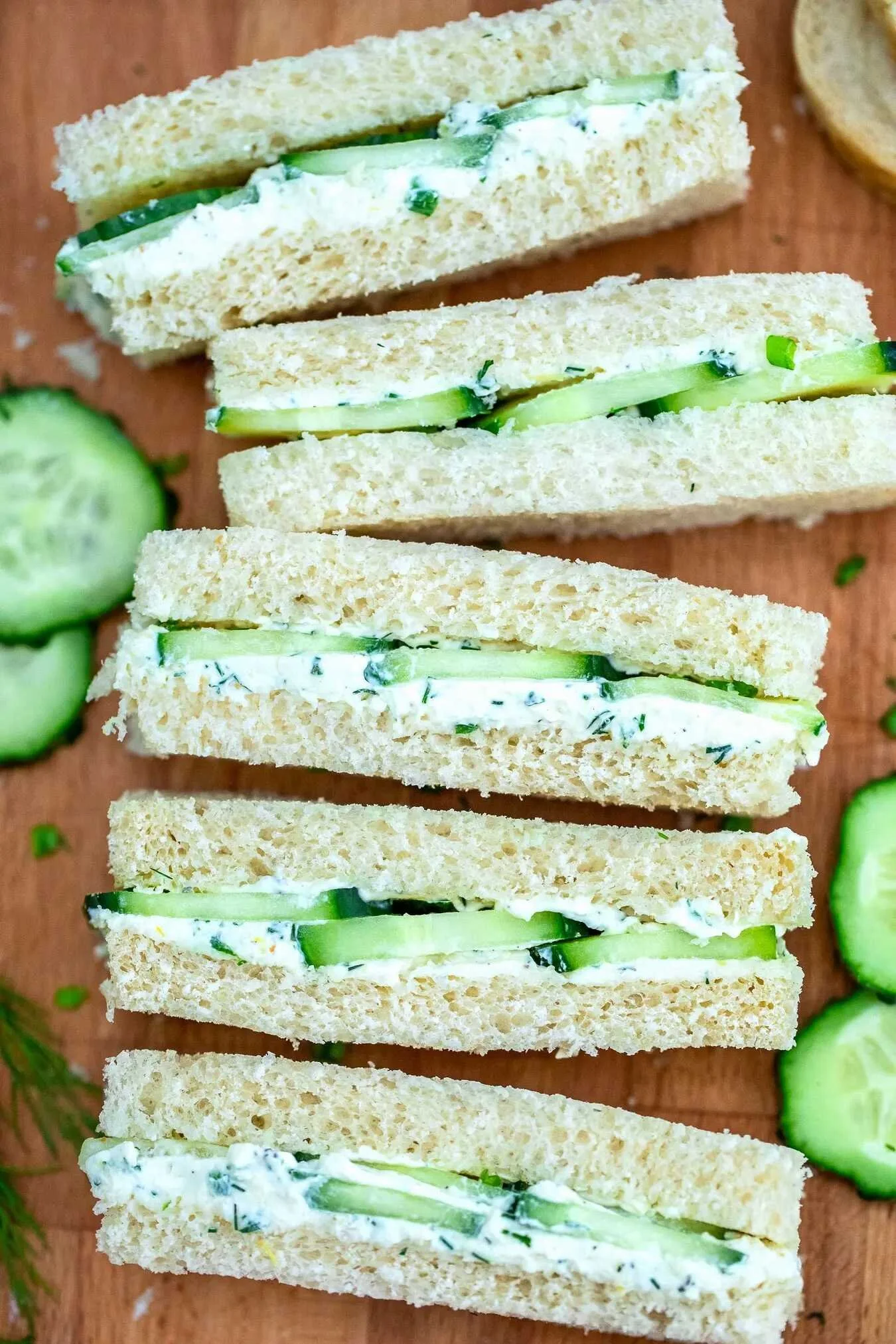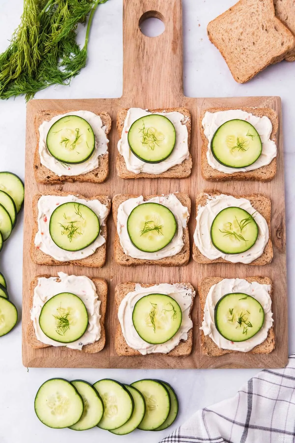 Cucumber tea sandwiches are a lighter breakfast, brunch or afternoon snack that is simple, quick and delightful. They're also great for tea party get-togethers! You can easily and quickly make a big batch of these fresh bites and arrange beautifully to serve on a tray. The cream cheese and fresh dill really bring out the flavor of the cucumber - yum! Recipe by 30 Minutes Meals.