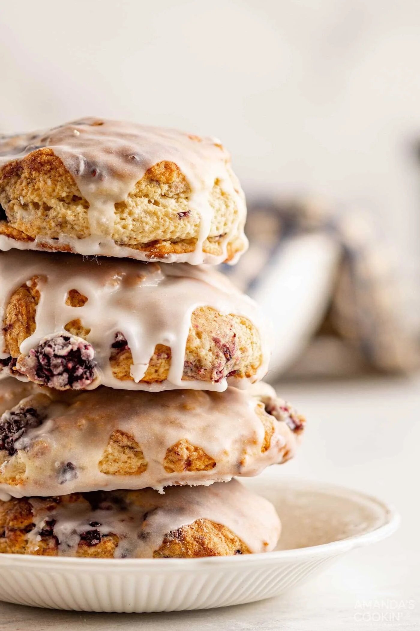 Jam-packed with luscious blackberries, delicate, creamy, mildly sweet Blackberry Scones are a must-try. Fresh blackberries are used in this recipe, giving it a somewhat sweet, tangy and buttery flavor that melts on your tongue. These floral, American-style scones are ideal for a tea party treat or to have on hand for the week. Recipe by Amandaβs Cookinβ.