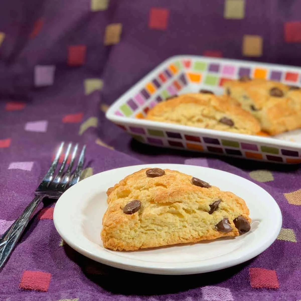 Scones with chocolate chips that melt in your mouth! With a deliciously crackly and crumbled crust, these are delicate and just sweetened enough. Most of all, they're quite easy to make - no chopping butter required and they're ready to bake in just 10 minutes. A pro baker tip is to spend a little more on quality baking chocolate chips or bar - they can make or break your scones. Recipe by Amanda Wilens.