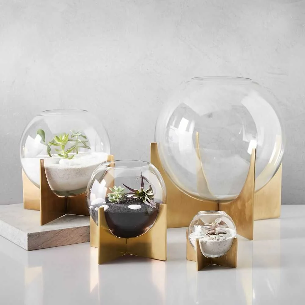 For those looking who prefer ultra modern aesthetics, West Elm makes terrariums with sleek details such as antique brass base for glass spheres.