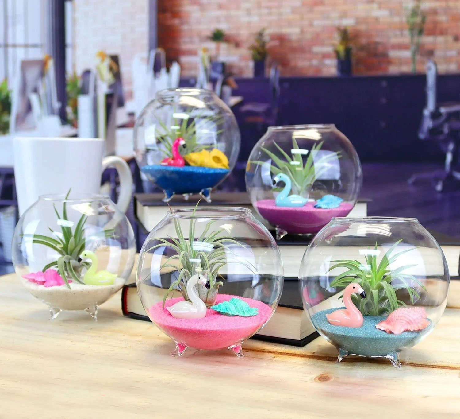 Add a tropical splash to your terrarium with colorful sand and whimsical flamingos. Accent with a bright seashell and youβve got living decor that can cheer up any space.