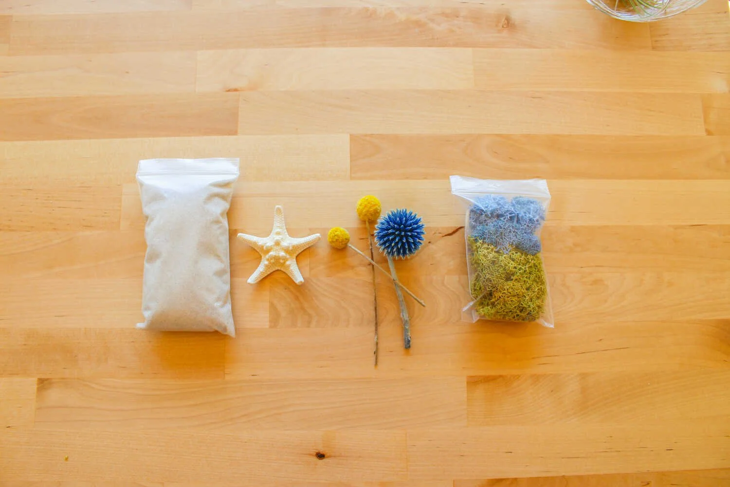 Shabby Chic comes with an adorable little starfish, blue thistle, yellow billy buttons and blue moss.