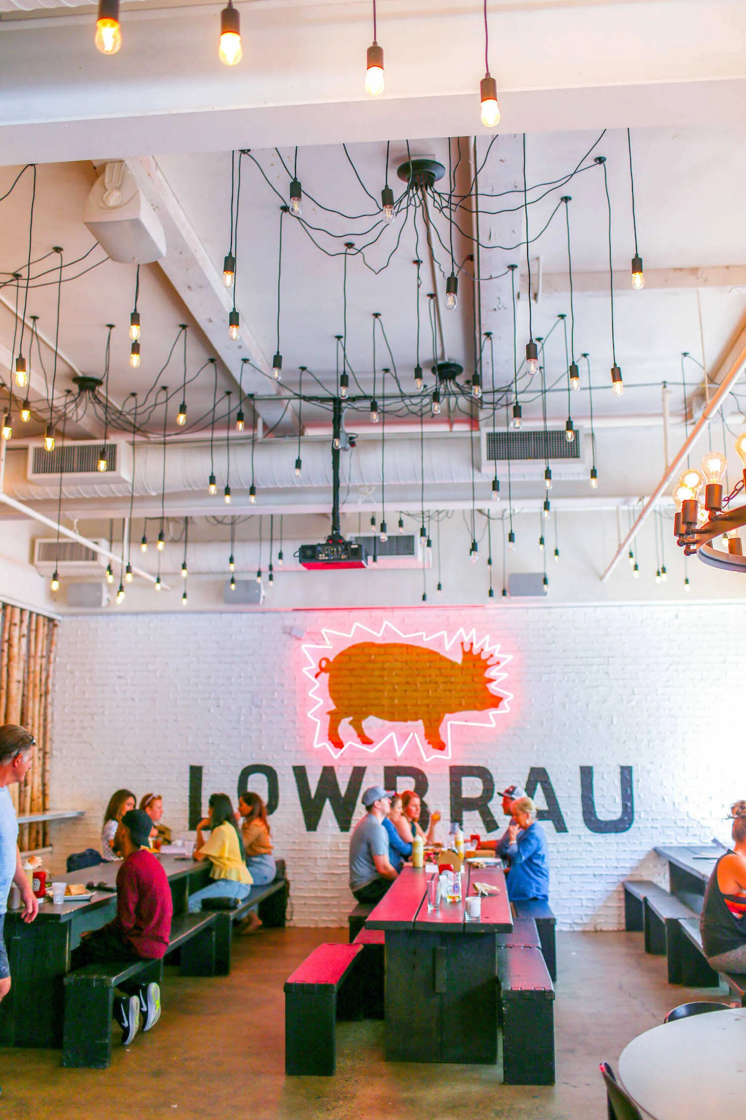 Lowbrau is a modern German pub serving traditional bratwurst and specialty meats prepared at Block Butcher Bar. They also serve German bier and other alcoholic drinks. Itβs a very popular weekend brunch spot and itβs centrally located in Midtown on 20th Street.