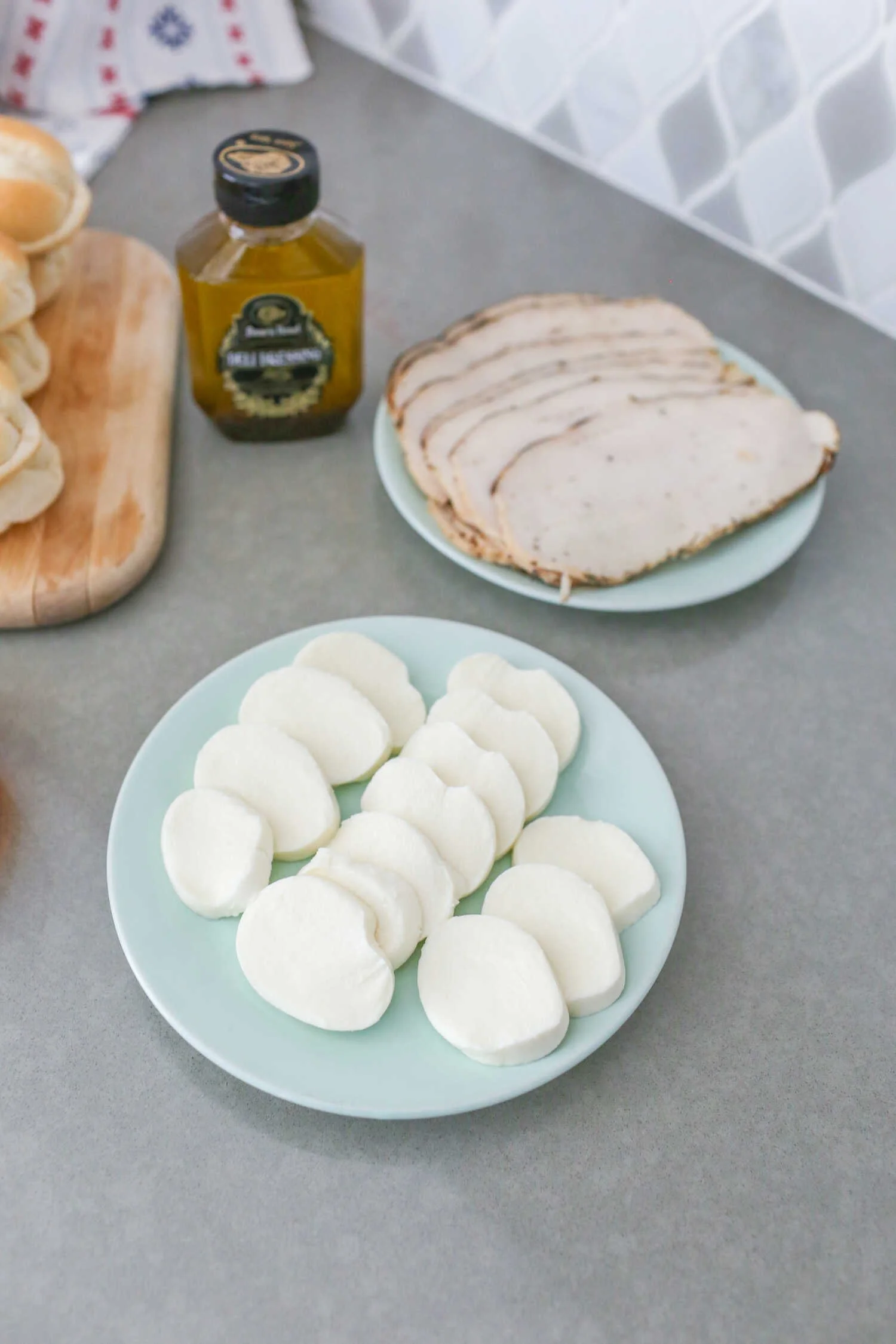 On the top slice add the mozzarella slices. Make sure they are laying flat and not overlapping. This way they can melt evenly for a better eating experience.