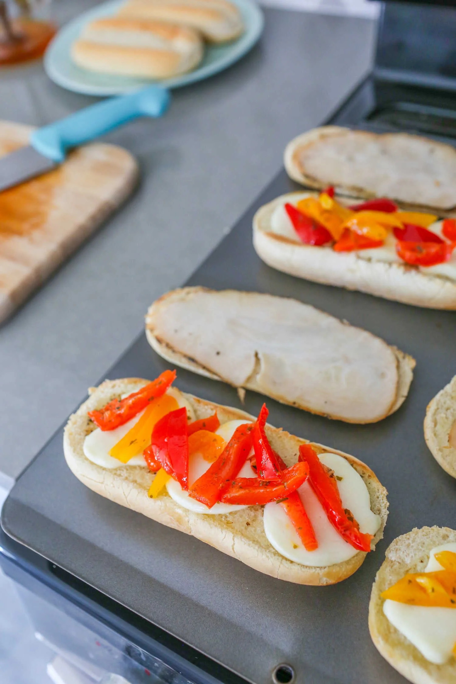 Carefully place the red pepper slices either onto the cheese slices or chicken side. Once added, put the two sides together and complete the sandwhich.