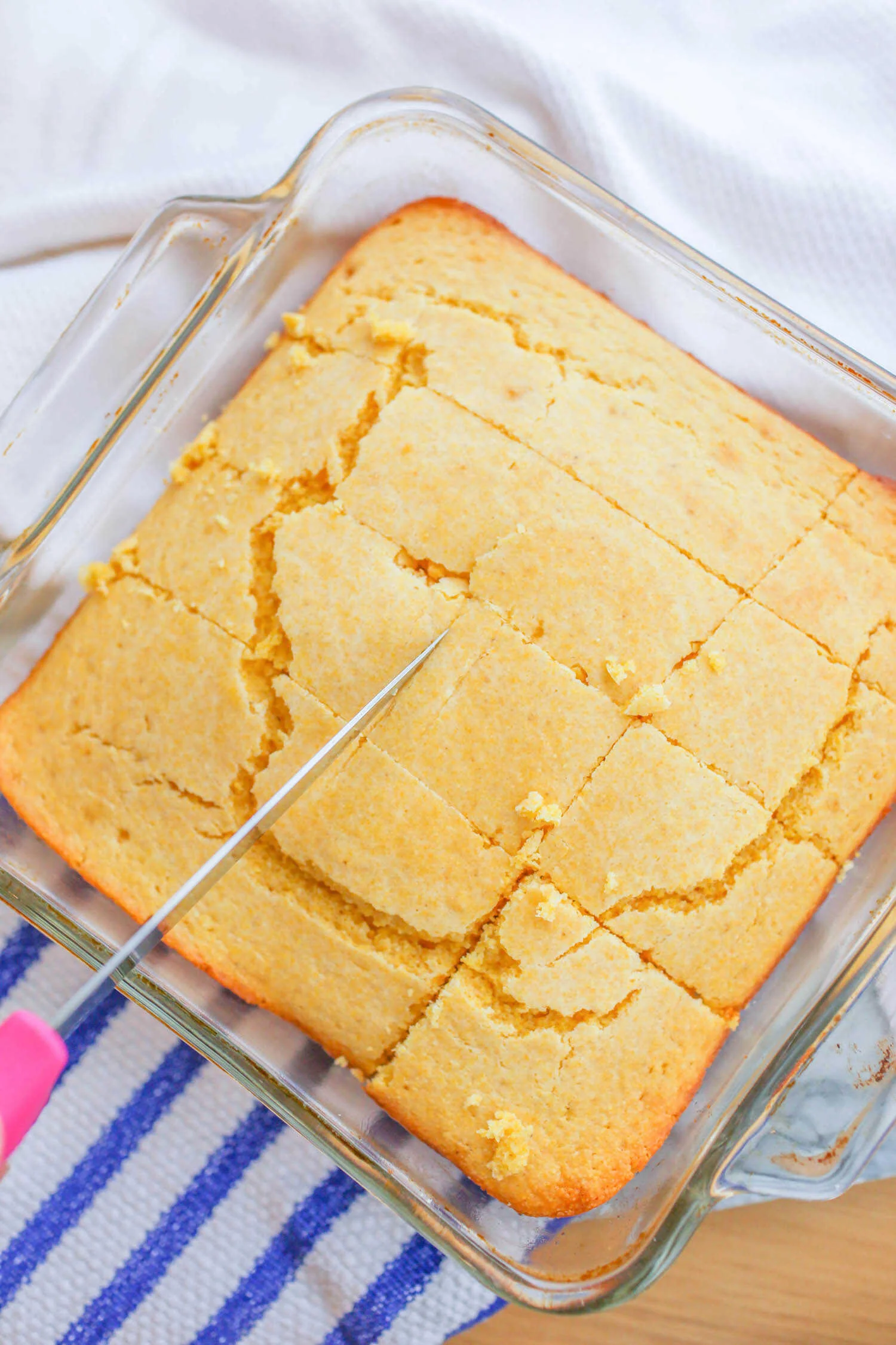 When I removed the pan from the oven, the top layer of the cornbread was a touch crispy and lumpy, but it tastes great!