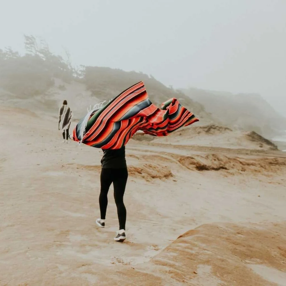 Growing up in Half Moon Bay we always loved using our Mexican serape blankets as beach blankets. They’re perfect because you can shake off the sand and throw it in the washing machine.