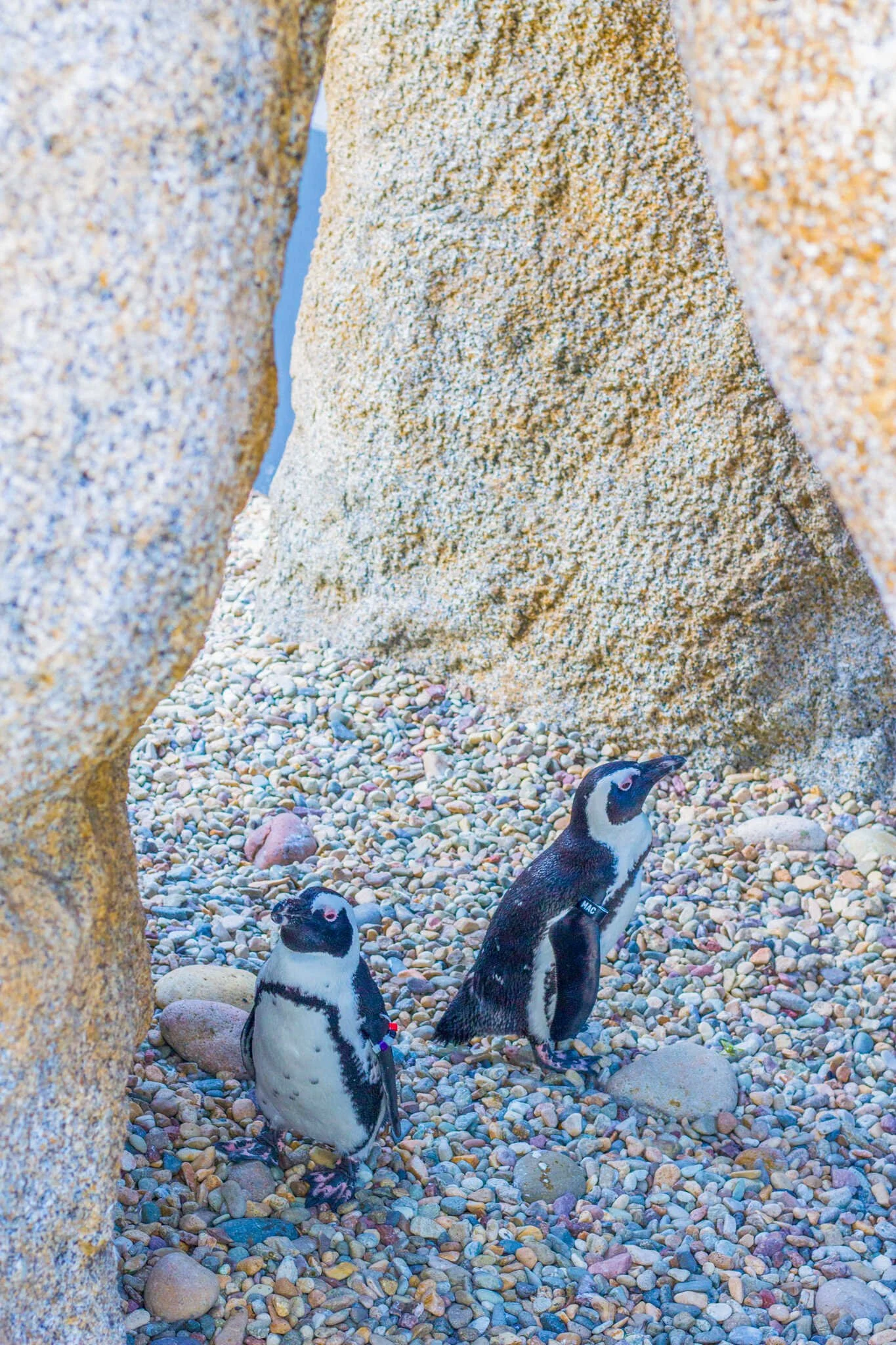 The exhibit was designed to mimic the giant granite boulders that are found on Boulders Beach in South Africa, a place where these penguins naturally live. The contrast of the penguins living in harmony with sharks is a sight to see, they swim side by side like little buddies.