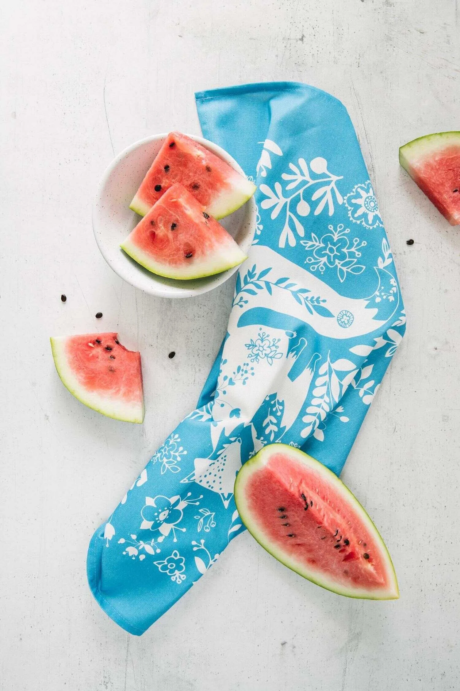 Cut one small watermelon into cubes and put about 8 cups aside for the salad.