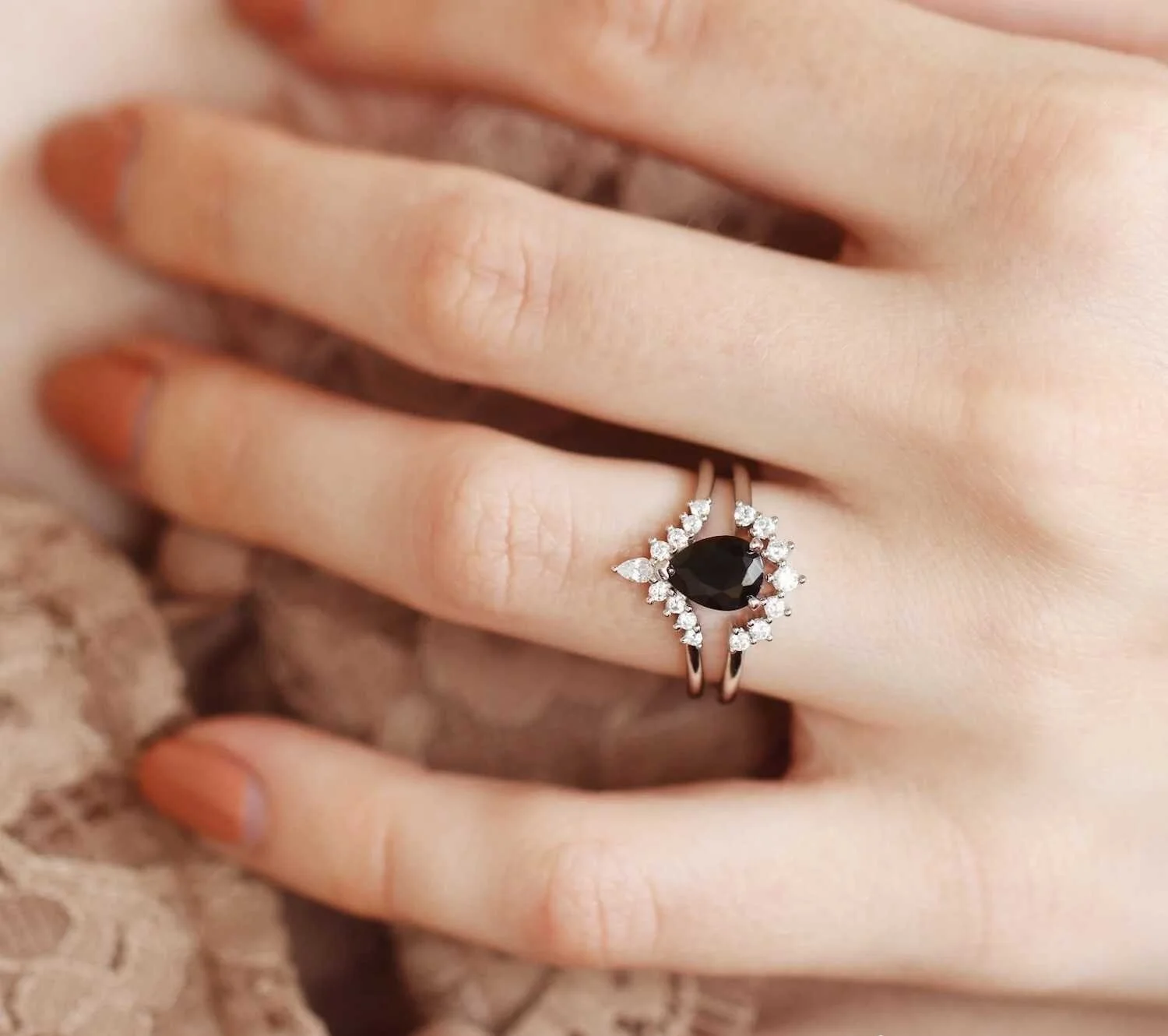 Black gemstones have been trending for unconventional brides, particularly since Sex and the Cityβs Carrie Bradshaw received her black diamond from Mr. Big. Black onyx is much more affordable than black diamonds, but still pairs well with sparkling white diamonds.