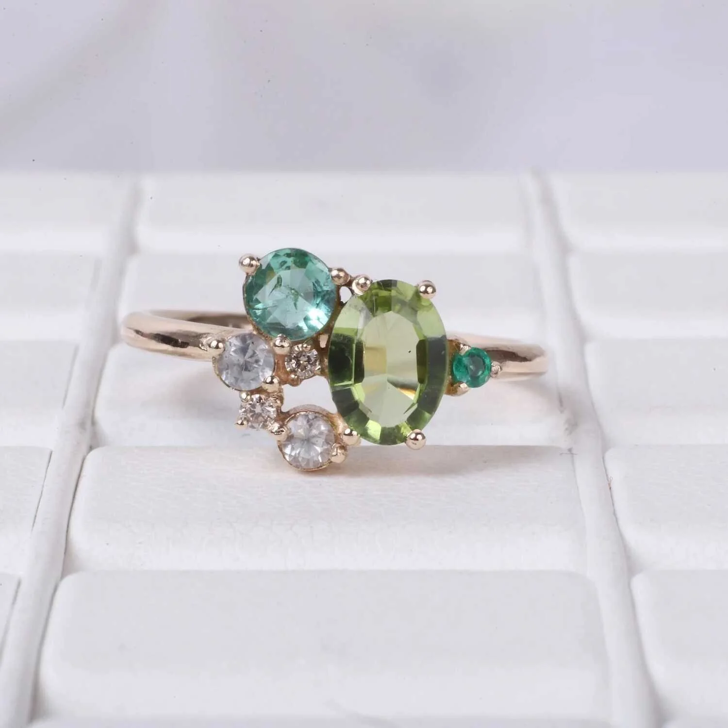 Peridot is the August birthstone and it comes in the perfect earthy shade of moss green. Peridot cluster rings often have nature-inspired foliage motifs.