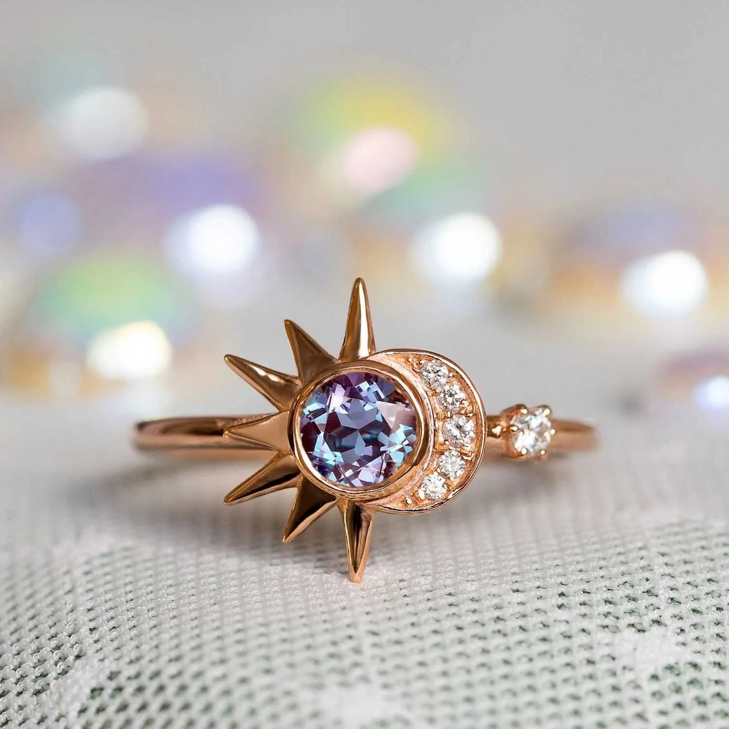 Moon ceremonies and celestial rituals are often incorporated into boho culture. Being that you and your partner are star-crossed lovers, it only makes sense to have a celestial moon and stars engagement ring that reflects this sentiment.