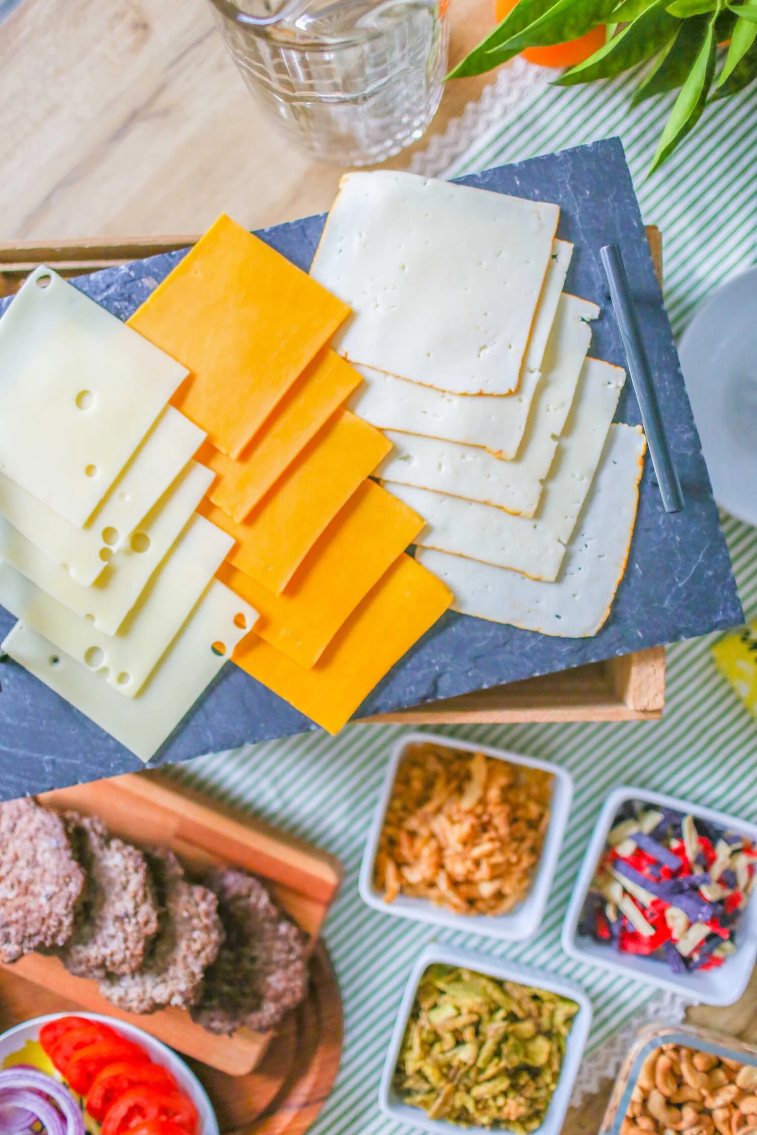 I must always eat my burger topped with cheese a.k.a. a cheeseburger. In keeping with the gourmet burger theme, I suggest giving your guests a plethora of cheese choices which they can mix and match. If you have the ability to melt the cheese on the grill then even better.