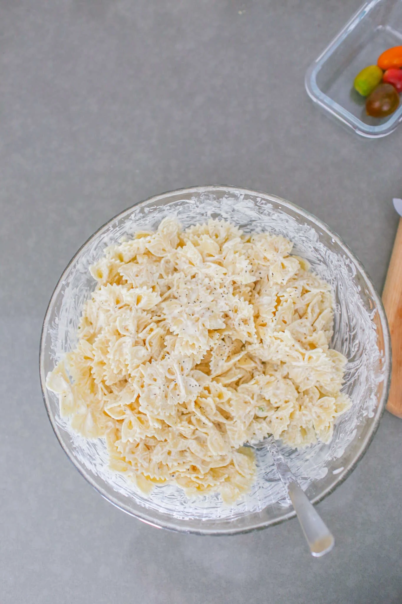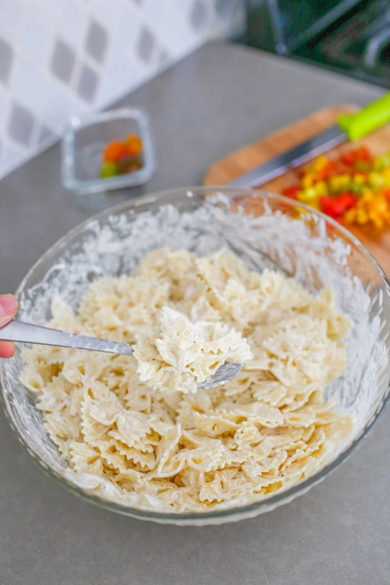 Put your cooked pasta into a large bowl and mix in your sour cream and ranch sauce. Stir until all the sauce until it is evenly distributed and all the pasta is coated. Add salt and pepper to taste.