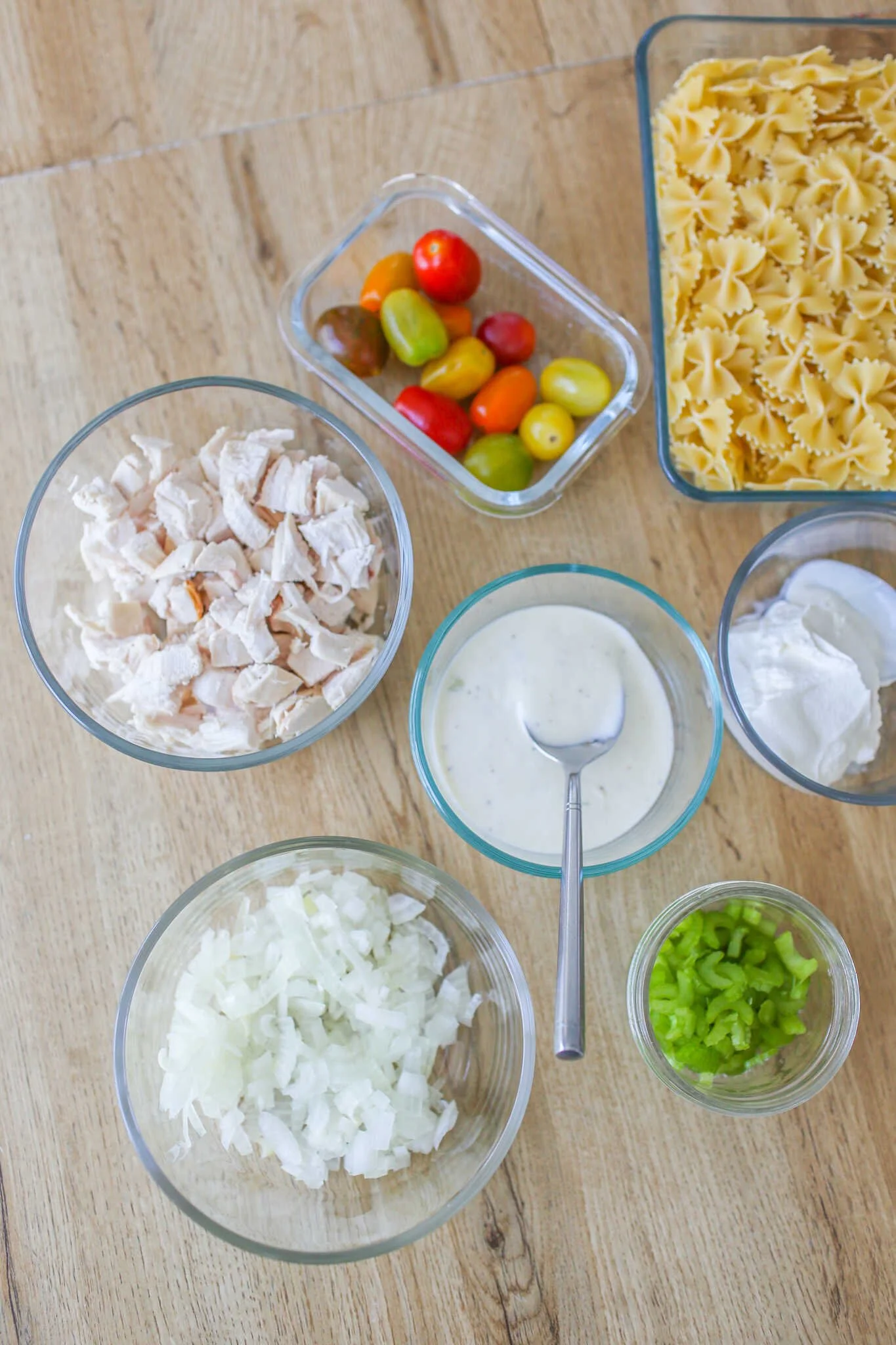 Once youβve got all the ingredients purchased, prep work for this recipe just requires chopping up the veggies, cubing the chicken and mixing up the sauces. Next itβs time to cook the pasta and bacon, chop the bacon, and then mix it all up. If youβre working diligently, you can make this recipe in under 30 minutes, and it yields a large amount of pasta salad to feed a crowd.