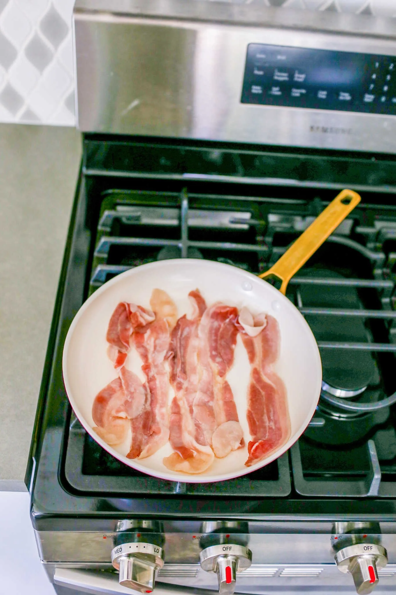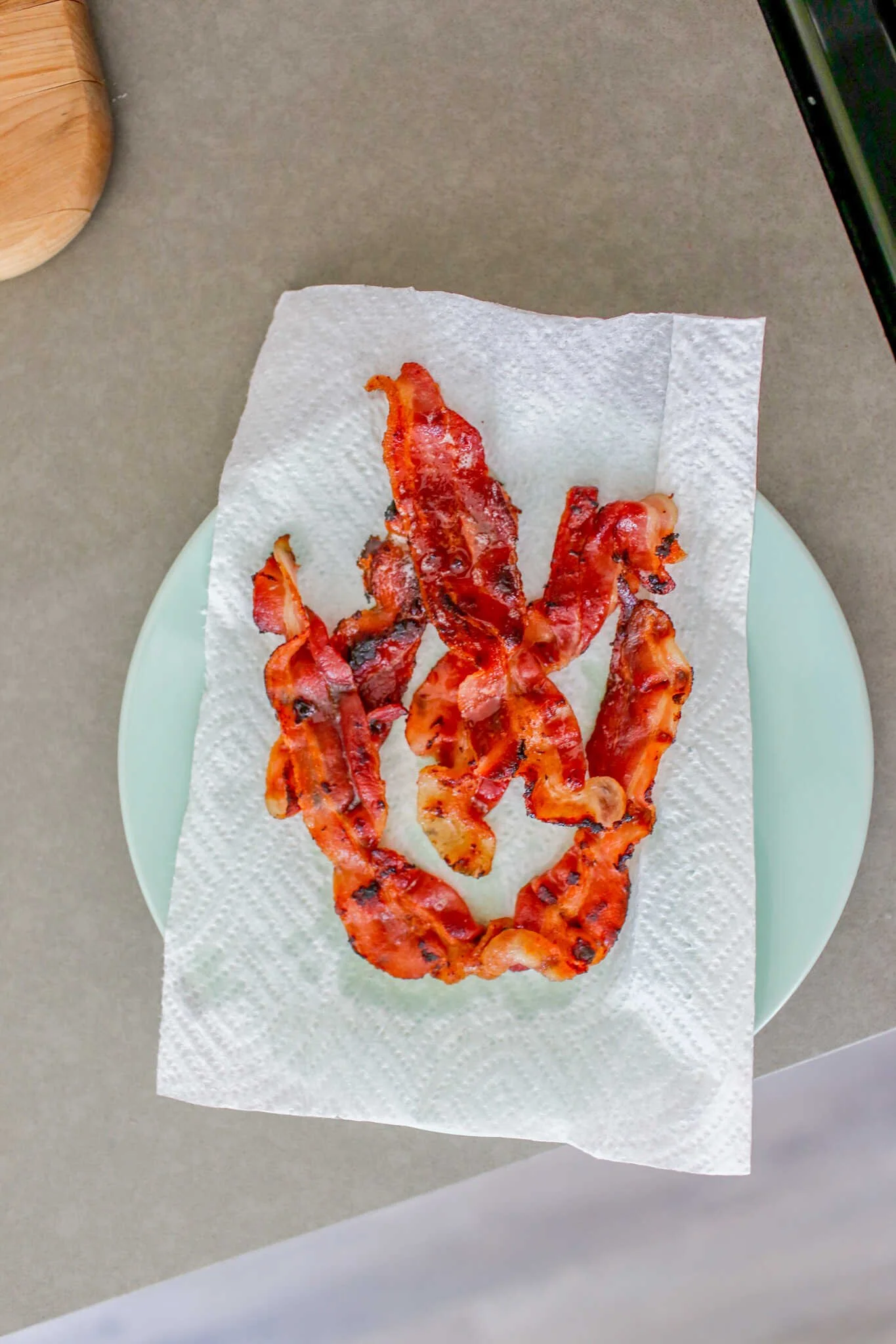 In a frying pan cook the bacon strips until they are crispy. After they are thoroughly cooked, lay them on a paper towel to absorb all the extra grease. Once theyβve completely cooled down, cut them into small pieces.
