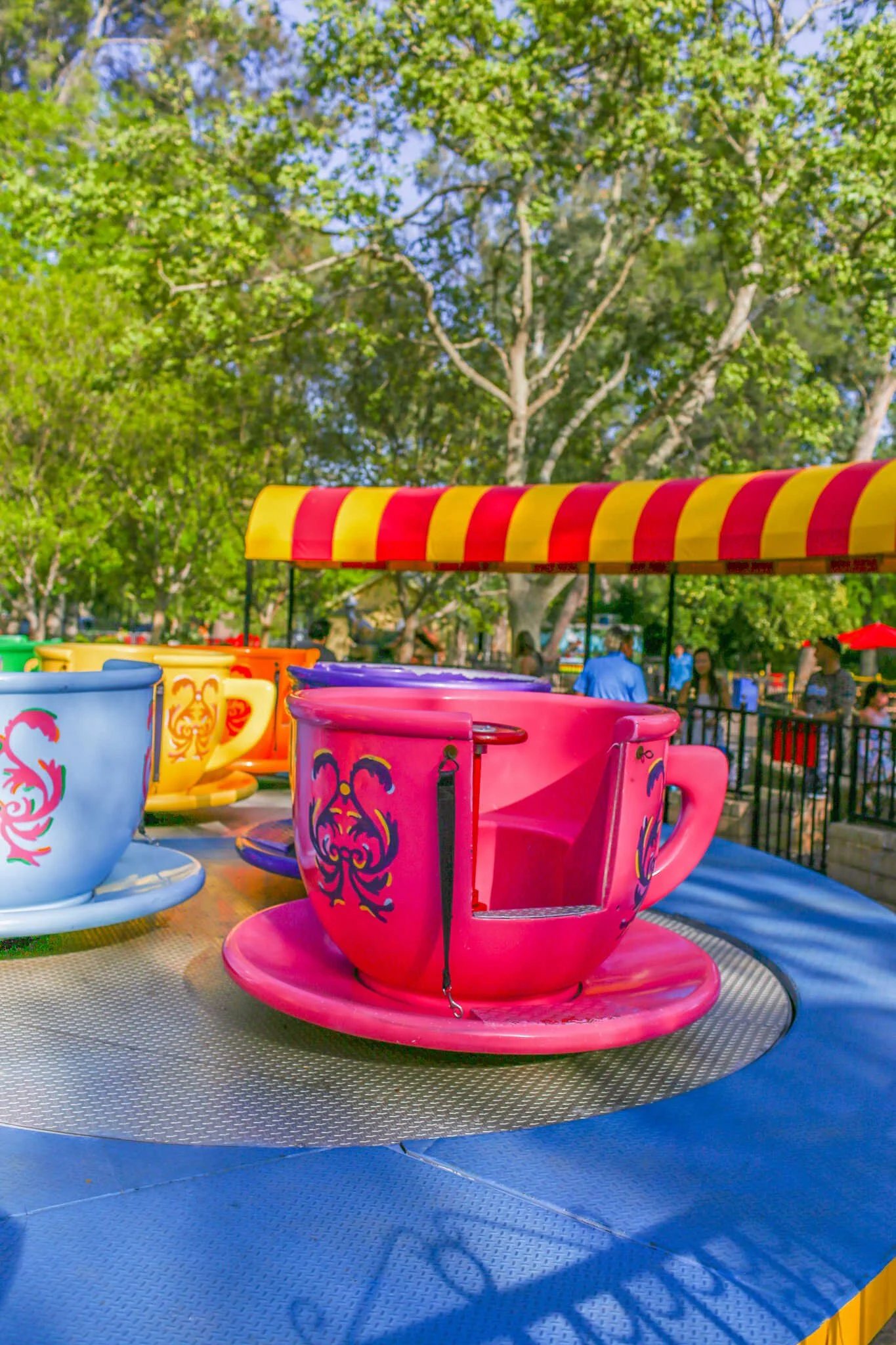 This ride is very reminiscent of the famous Alice in Wonderland spinning teacups ride at Disneyland. They have designated that children must be at least 2-years-old to ride this ride. While the ride is in motion, if you sit in the teacup without manually spinning the center wheel, it doesnβt spin super fast. That being said, if you have a child (or adult) that is prone to motion sickness or vertigo, I would skip this ride.