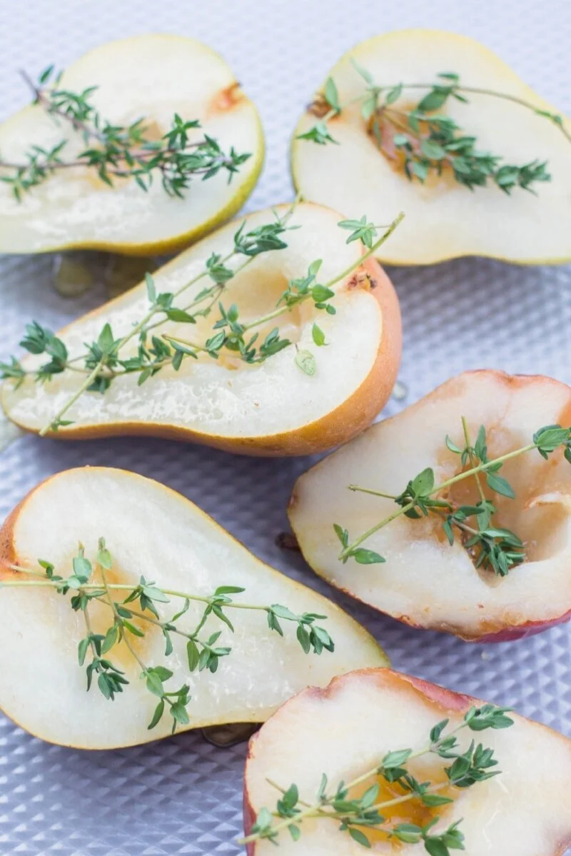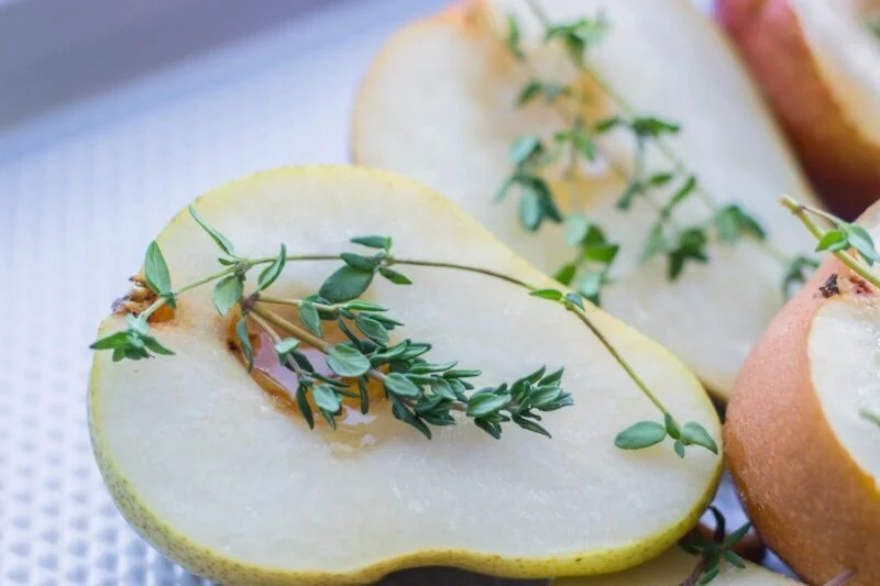 Step 4: Garnish with Thyme sprigs on top and place in heated oven. Bake for about 10 minutes or until pears are soft enough to pierce with a fork.