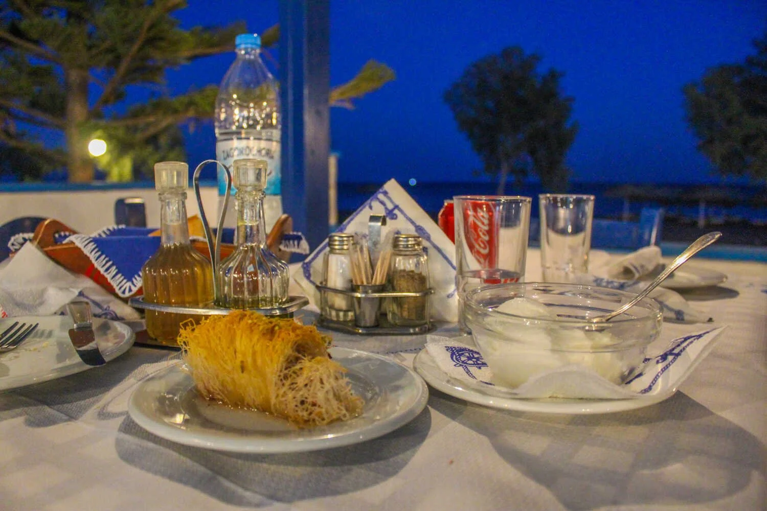 In the traditional tavernas - you can often tell them apart by the wooden chairs and distinct tablecloths - there will almost always be some free dessert, fruit, or Greek liquor at the end of the meal along with your bill. Don't forget to hail the waiter for it since Greeks love lounging around after their meal and chatting away for hours.