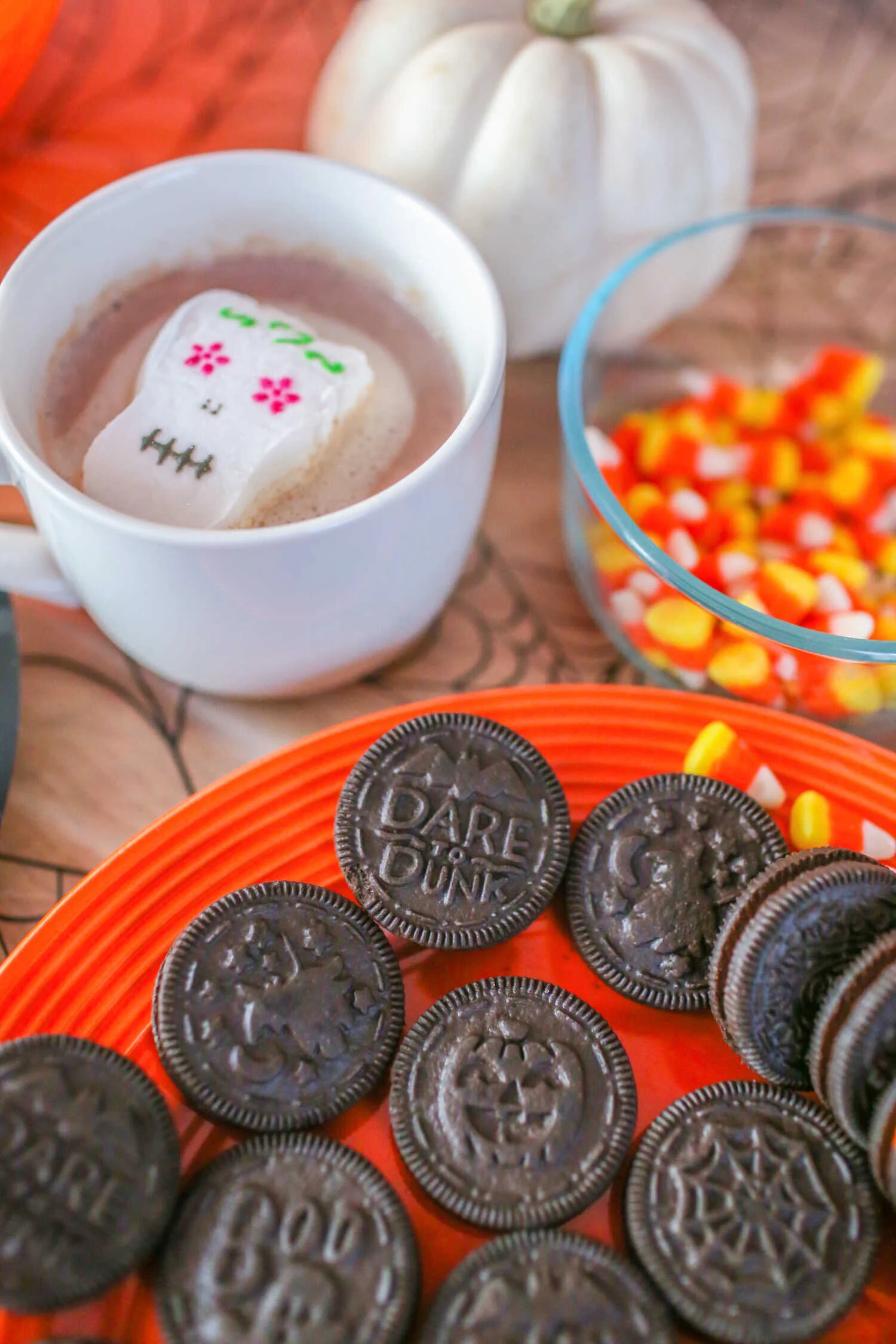 For our hot chocolates we used Halloween Peep marshmallows including pumpkins, Frankenstein monsters and sugar skulls. Target sells the best selection of Halloween Peeps!