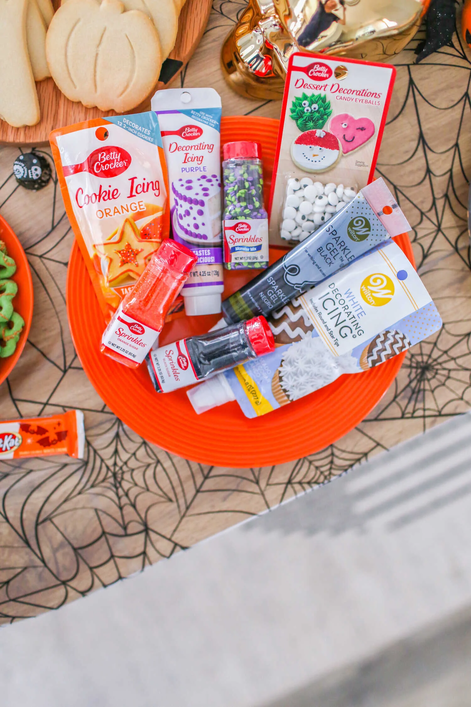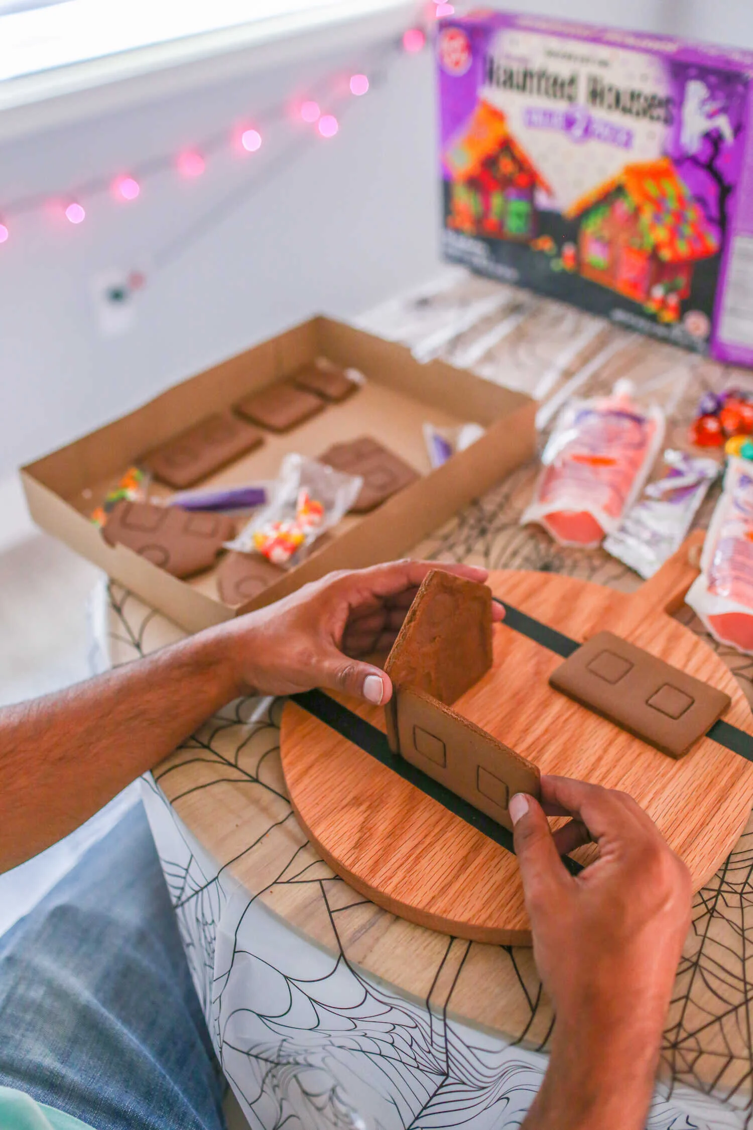 We ordered our Halloween Haunted House Cookie Kit from Target because they have a ton of really cute options. This was our first time building a gingerbread house and we made a rookie mistake - we started building the house before decorating. I advise that you decorate all your pieces before the assembly process begins. It can be difficult to add the icing and sprinkles on a standing cookie house.