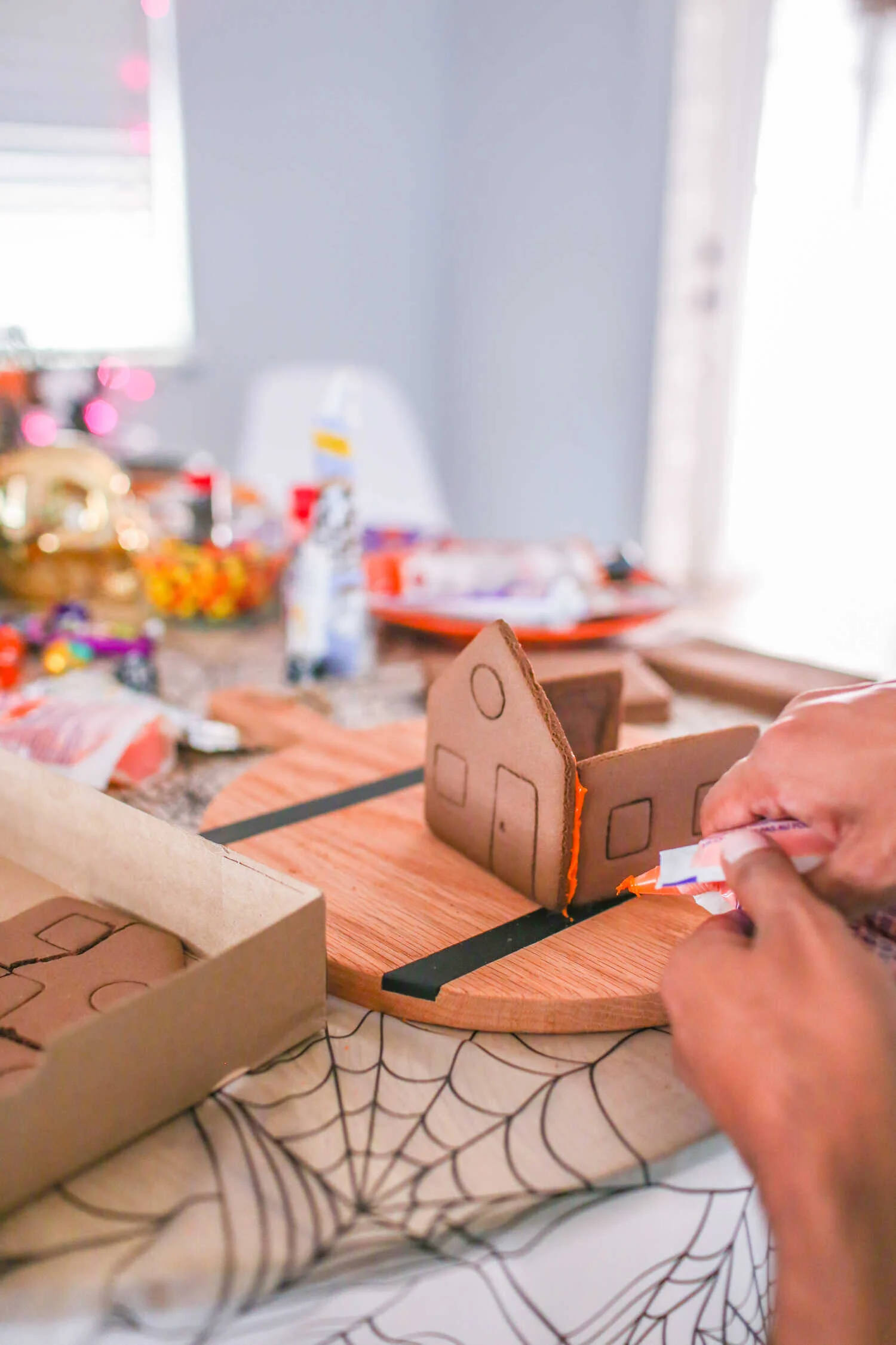 Another pro tip is to build your house on a wooden board so that itβs easy to transport around your home. You can also make a whimsical scene on the board with candies and props. I had adorable little candy pumpkins and I made a walkway leading up to the house.