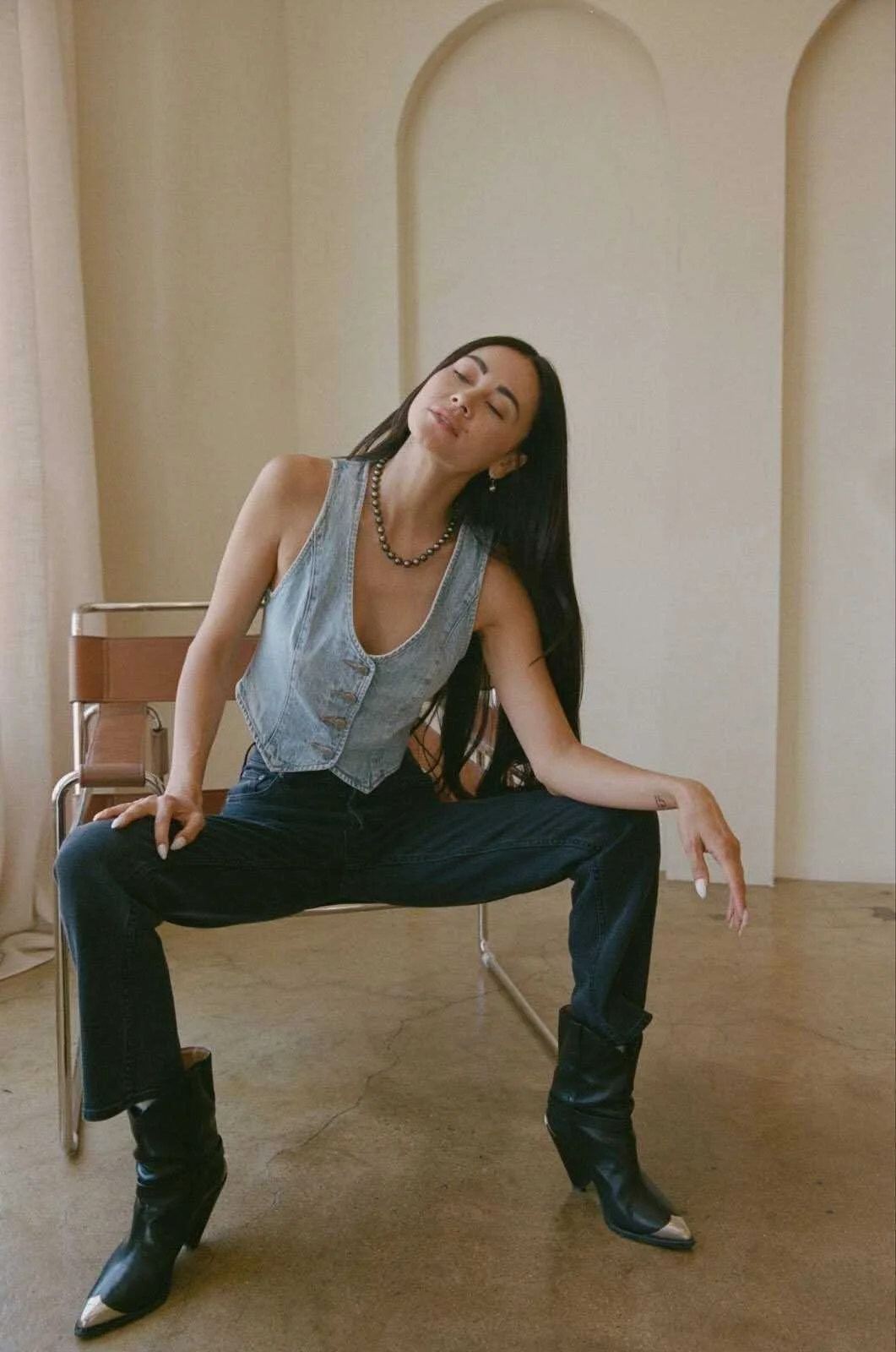 With denim, go for high-luster studs or a short strand at the collarbone; the glow lifts a tee-and-jeans uniform into something that reads styled, not precious. For leather, pearls work because nacre has a gentler kind of light than metal; try a single baroque pendant on a simple chain as an anchor, then keep everything else clean so the contrast feels intentional rather than costume.