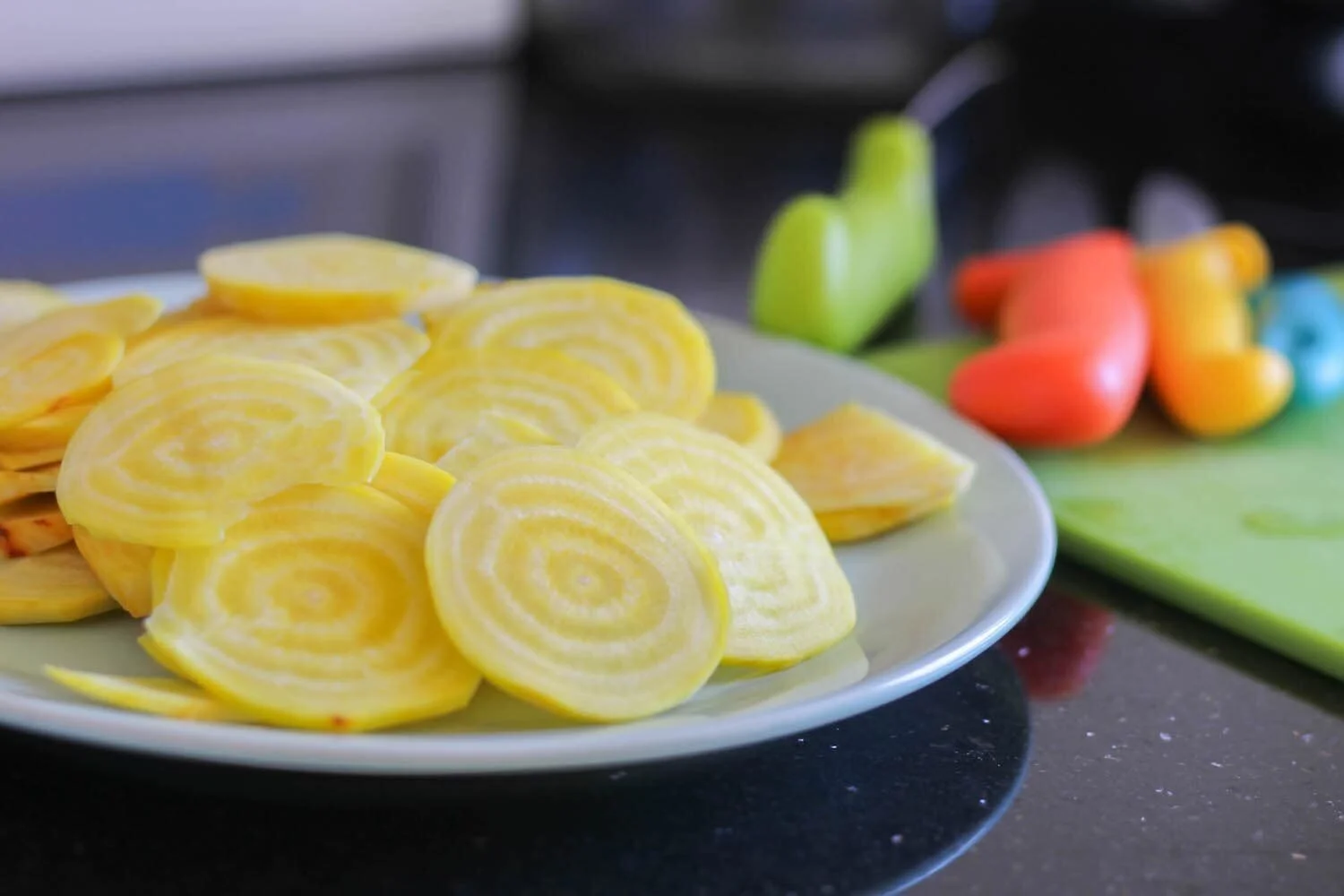 Just as the old saying goes, you can't judge a book by its cover and the same goes for your vegetables. I will admit that at first glance these rainbow beets are a bit ugly don't necessary look super appetizing. But all you need to do is take out your vegetable peeler and remove the rough outer layer to find the beautiful yellow rings inside. These beets were so sweet and crisp and made the perfect base for colorful salad.