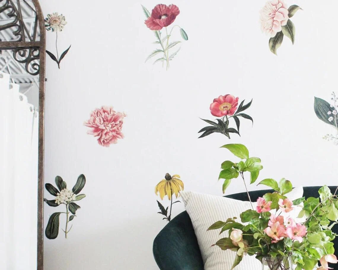 Surround yourself with red velvet flowers and deep saturated tones of burgundy in this floral themed room. I love the scarlet red velvet sofa!