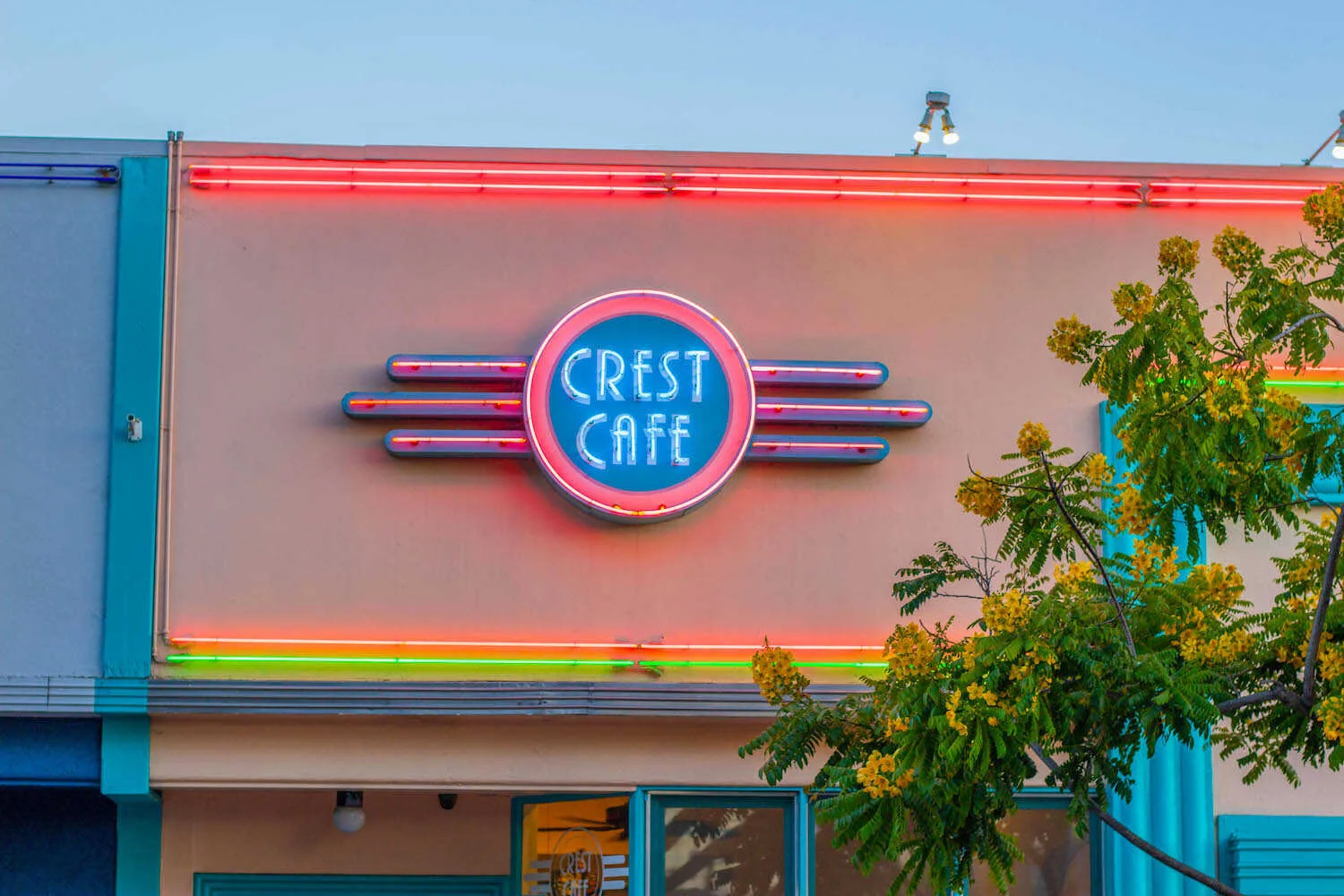 The exterior of the Crest Cafe is lit up with neon lights and colorful murals, while on the inside they serve hearty classic comfort food. If youβre planning a visit to San Diego with children, the Crest Cafe is one of the few kid-friendly places in Hillcrest. They even have a kidβs menu for children 5 years and younger.