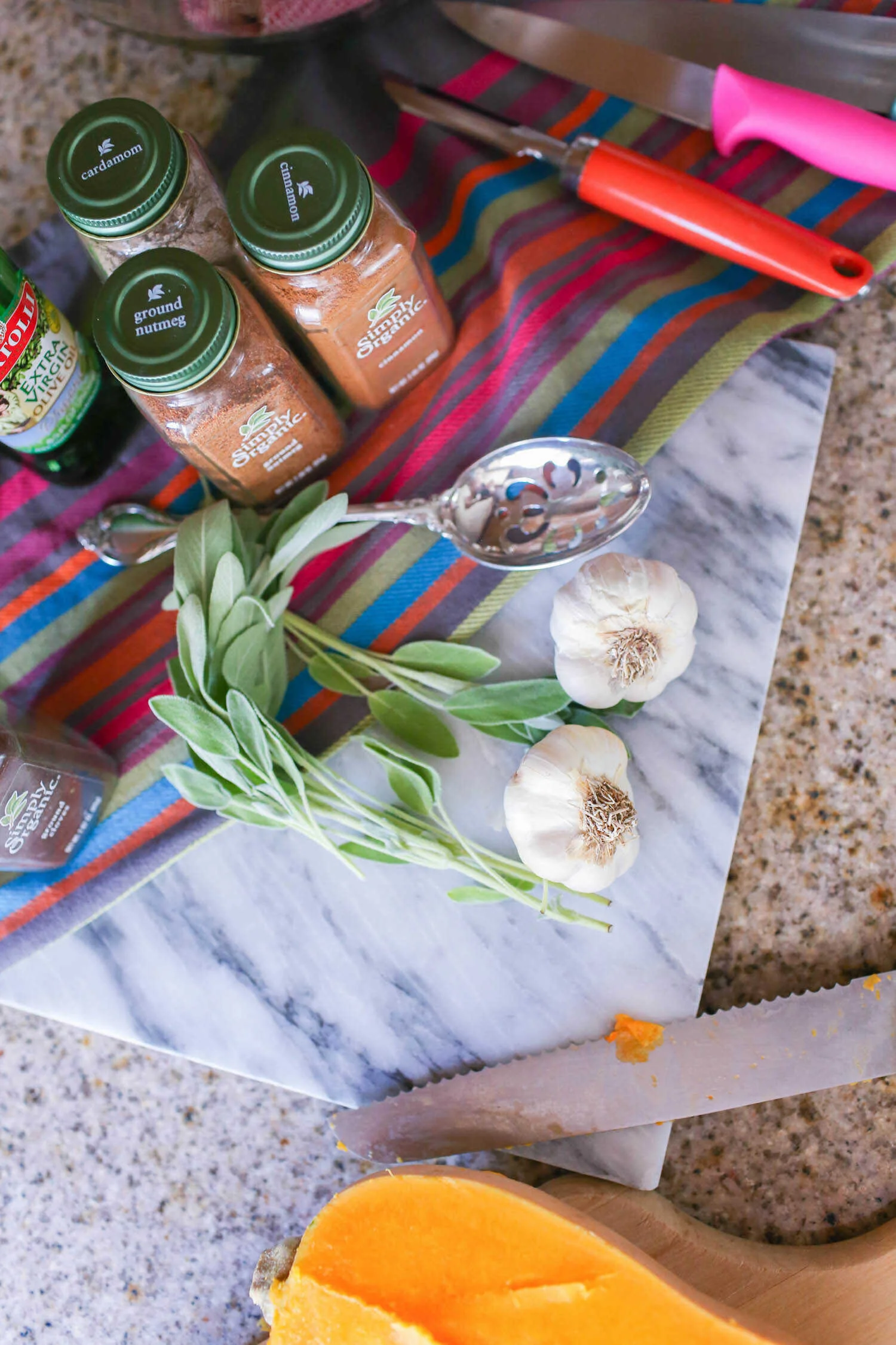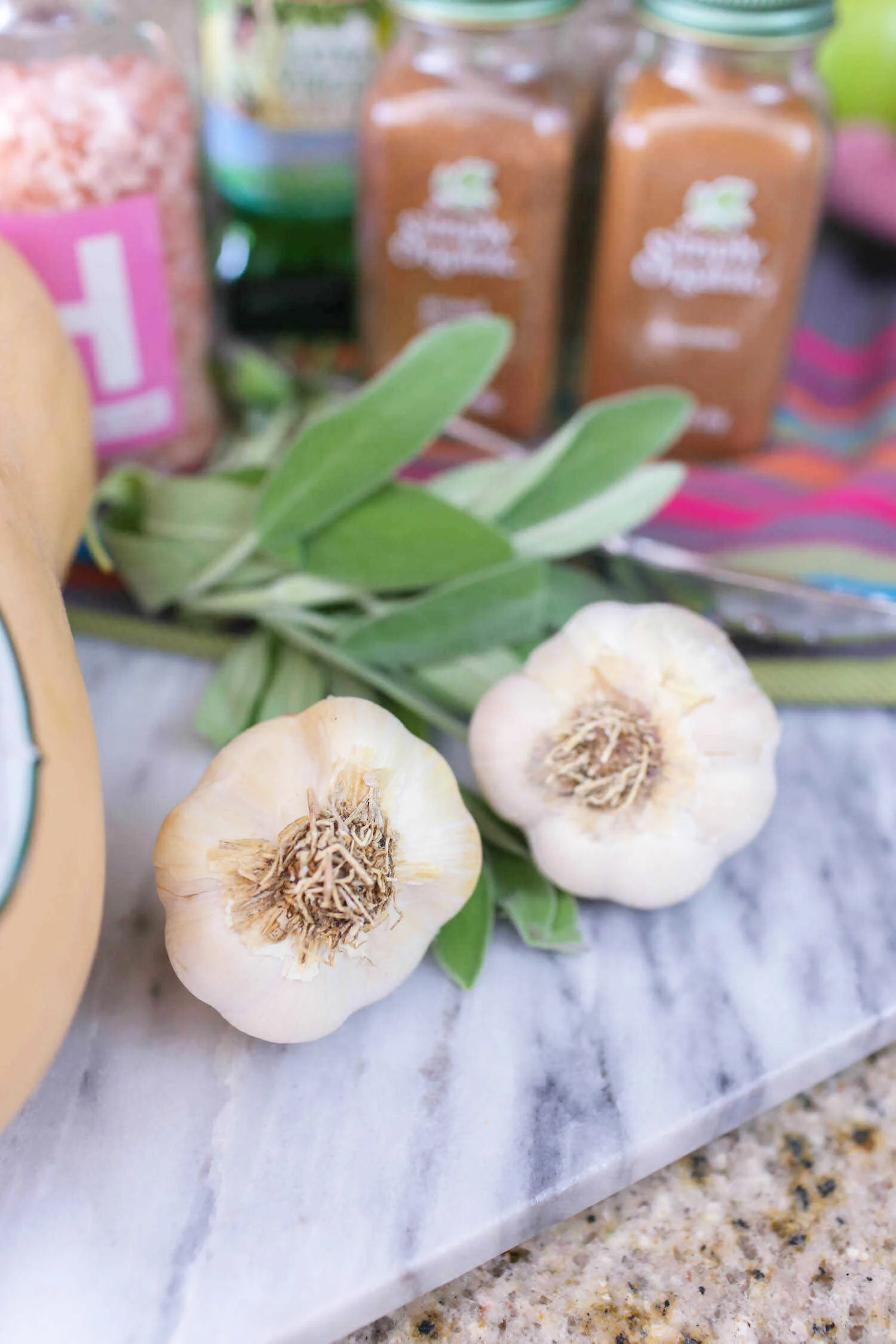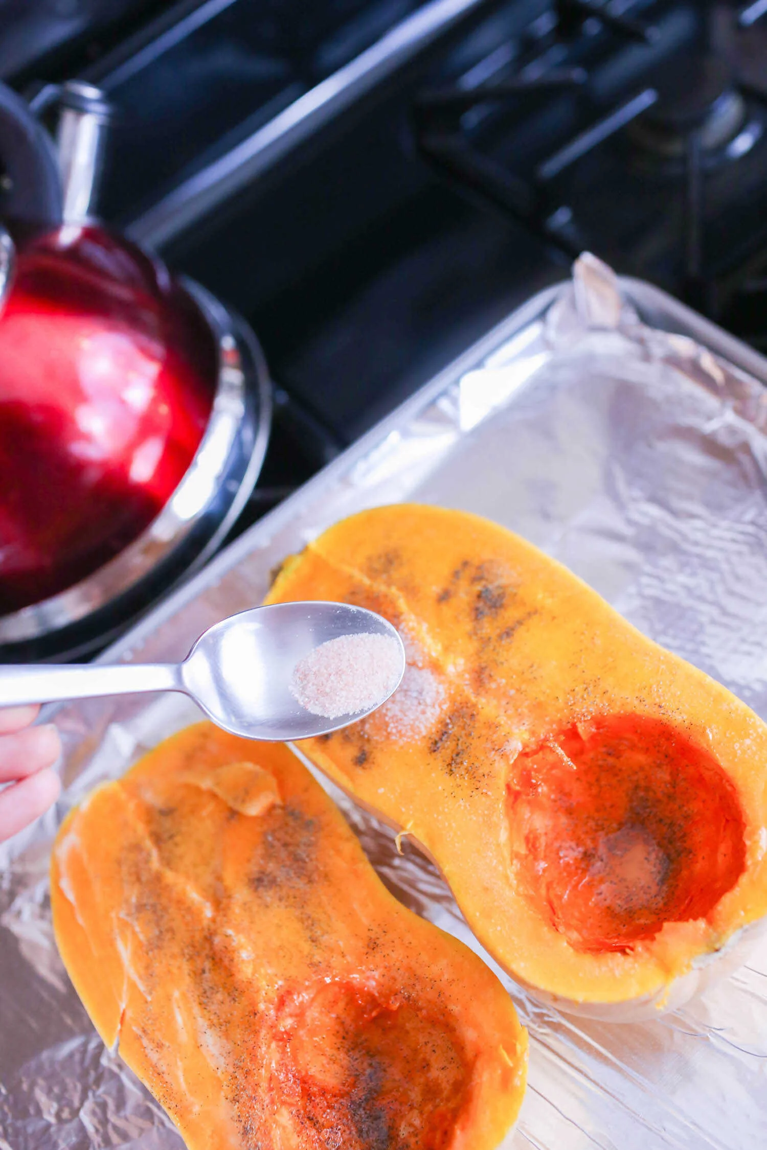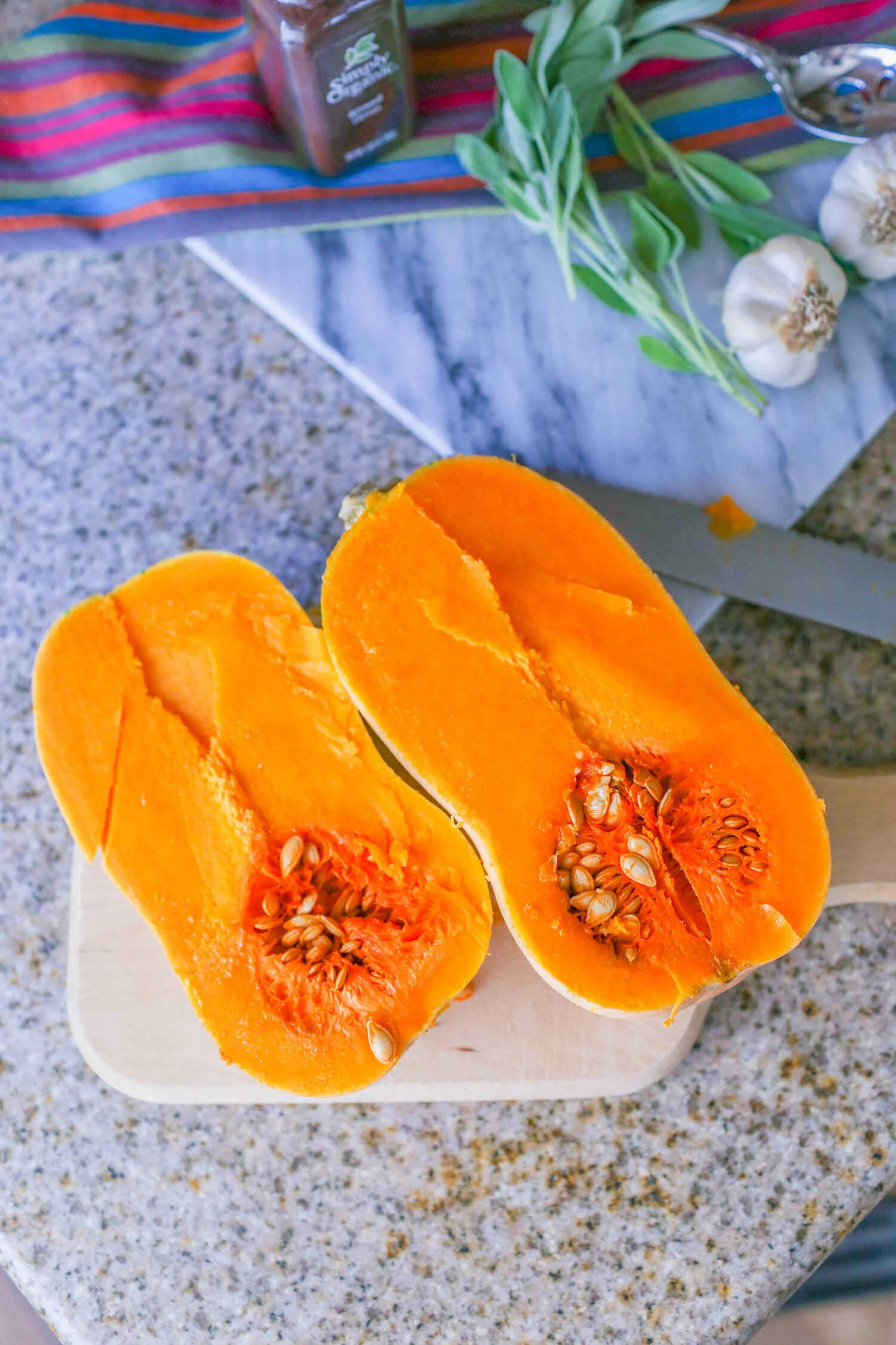 Cut the butternut squash in half the long way (see images in blog post). Scoop out all the seeds.