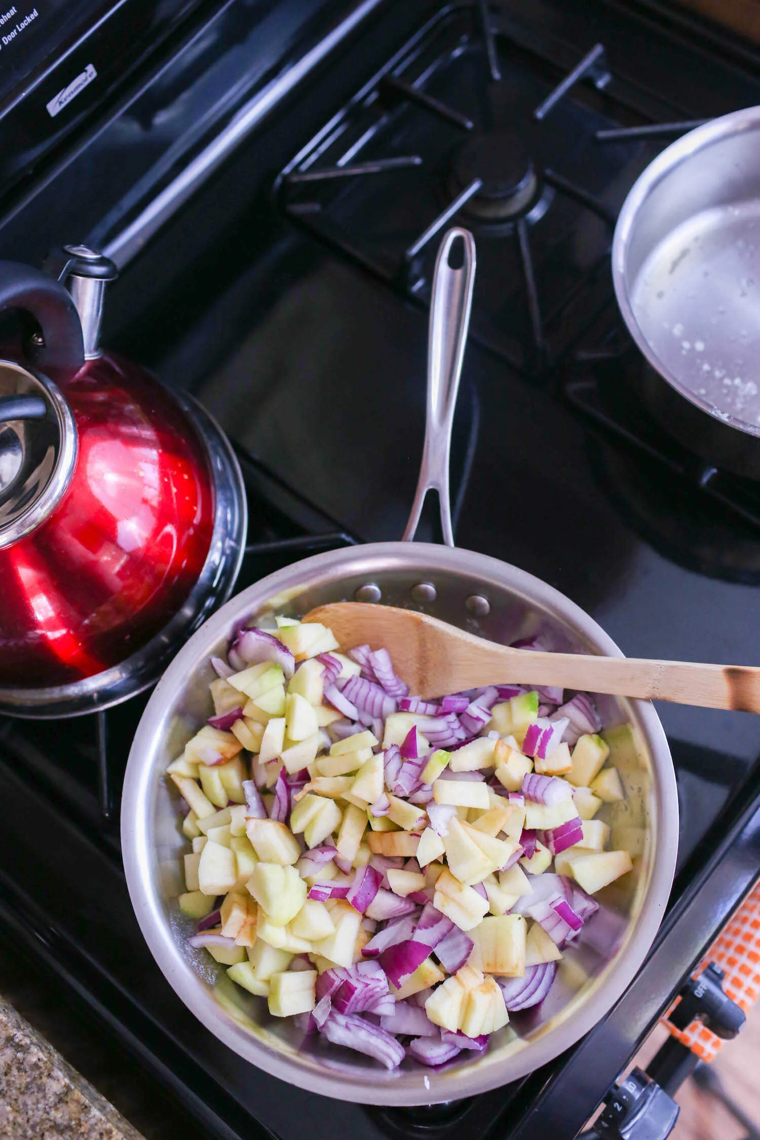 In a large skillet pan, melt the second tablespoon of butter. Add the apples and onions. Stir in the sage, salt and pepper.