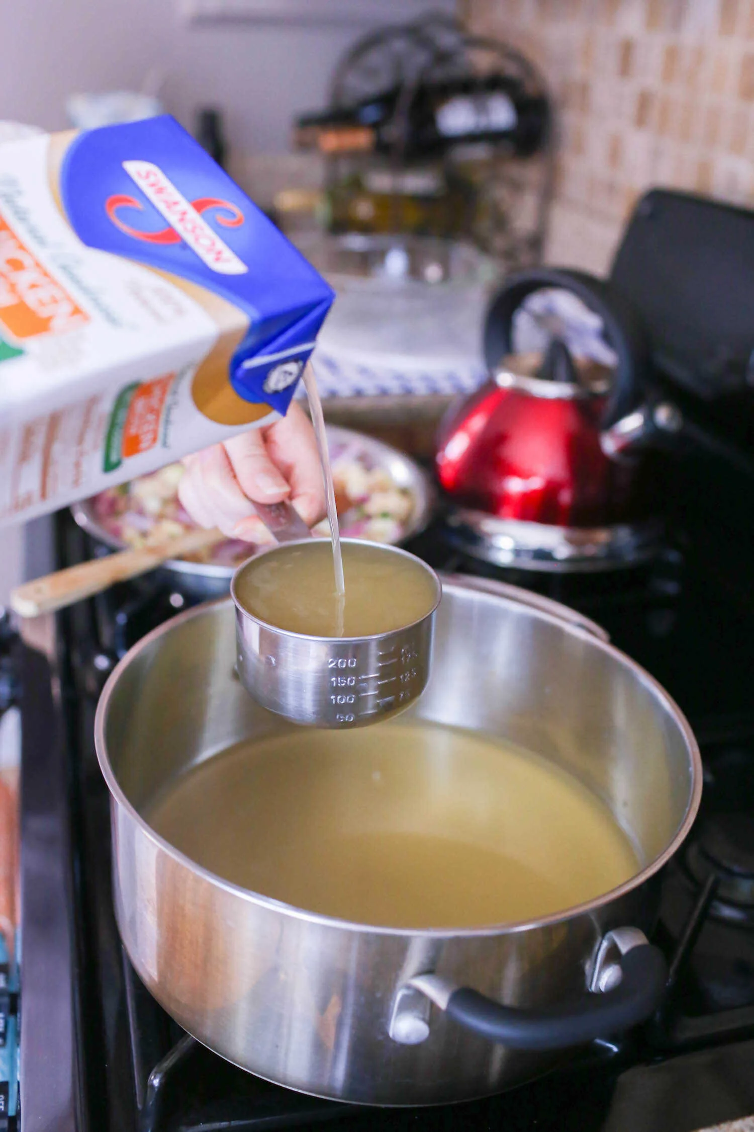 Add the broth and water to the pot. Depending on your tastes, you can add more salt and pepper.