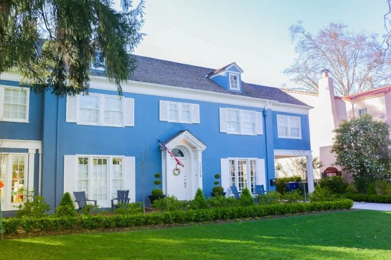 Lady Bird's dream home is this stunning blue mansion (see photos) located in "Fabulous Forties" neighborhood of East Sacramento. Long considered one of the cityβs most fashionable neighborhoods, it makes for a delightful stroll with hints of an older era of elegance and privilege. The streets are lined with Colonial and Tudor homes which appear several times in the film and quite honestly are even more stunning in real life. The blue house from the film is located on the 1200 block of 44th Street in East Sacramento.