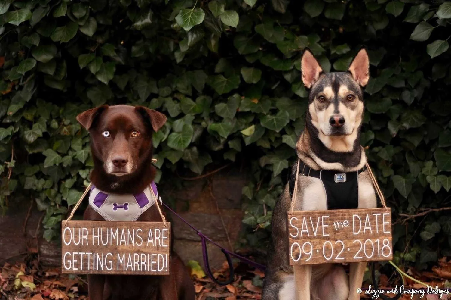 We had our doggie Holly in our pregnancy announcement photoshoot and they turned out so cute! You can order a custom made wooden pet sign with your wedding date for a sweet save the date photo session.
